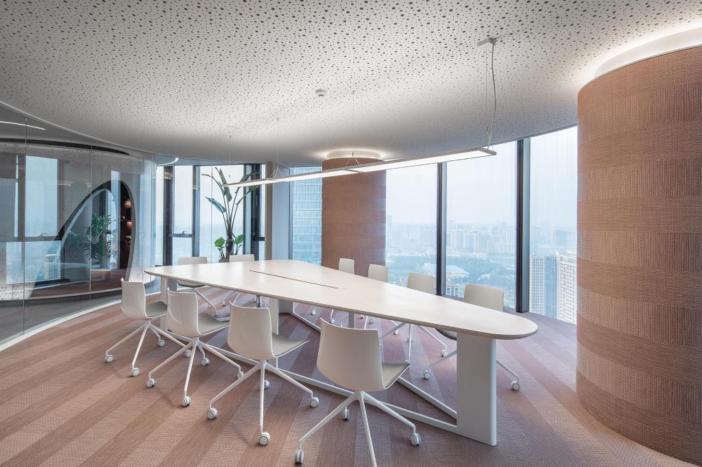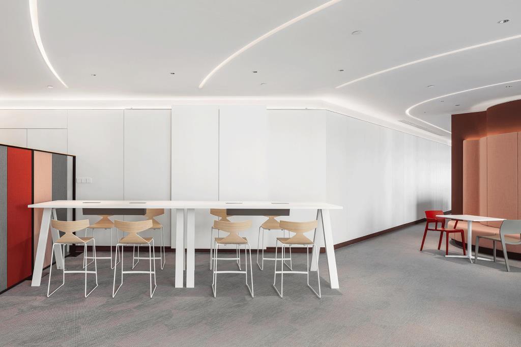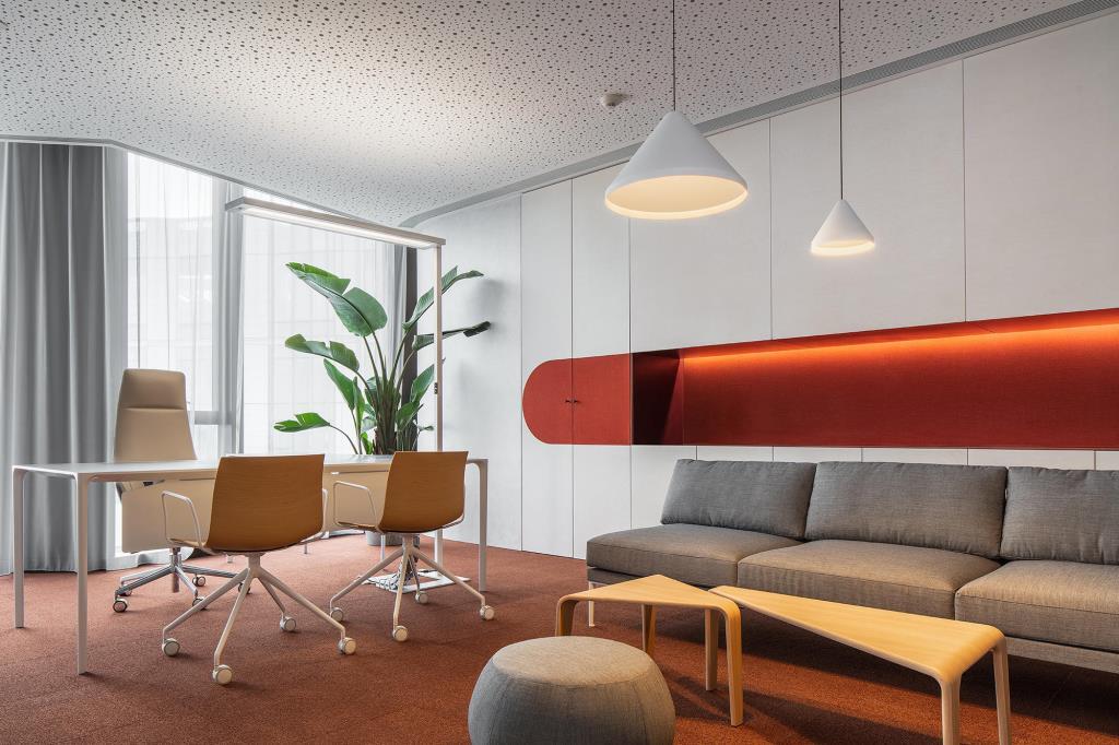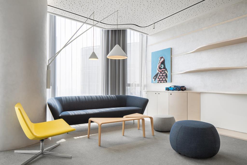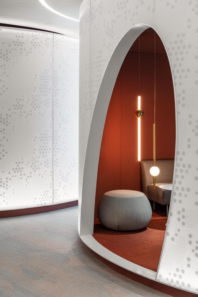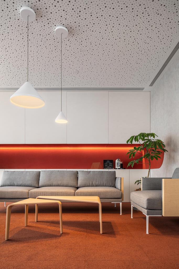 Un’illuminazione d’ambiente, diffusa da luci curvilinee annegate a soffitto, segue e ammorbidisce il profilo dei volumi architettonici creando un percorso visivo morbido e fluido. Gli uffici privati di rappresentanza dei soci fondatori, dagli interni essenziali ma accoglienti, sono collocati nella zona più interna e isolati acusticamente per garantire la giusta privacy durante gli incontri più importanti, mentre spazi ufficio e sale riunione sostituiscono le tradizionali postazioni con pouf e soffici divanetti all’insegna di modalità di lavoro libere da vincoli.