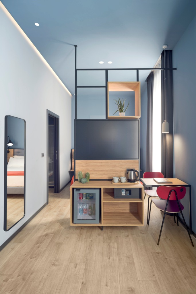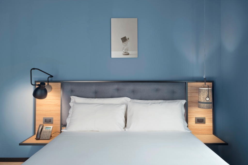 Le 57 camere dell’albergo sono organizzate su tre piani, ci sono poi il bar e la sala colazioni, un’area lounge e una sala meeting. Tutti gli spazi sono stati completamente riconfigurati, con l’obiettivo di creare ambienti funzionali e accoglienti. In particolare, le camere, dotate di ogni comfort, sono caratterizzate da arredi realizzati interamente su disegno e da una particolare attenzione rivolta all’illuminazione.