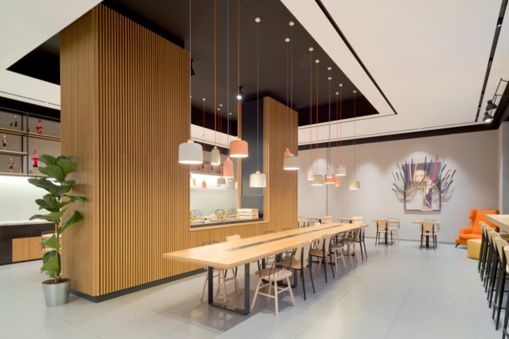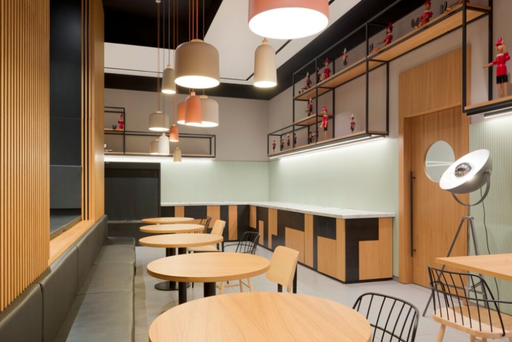 Al piano terra, nella sala colazioni, lo spazio è organizzato intorno a due elementi strutturali centrali rivestiti in listelli di legno. I materiali scelti per gli arredi sono il rovere con finitura naturale, la lamiera di ferro e il marmo di Carrara. Il design è di impatto e allo stesso tempo raffinato, caratterizzato da un intenso uso del colore, da dettagli unici, elementi d’epoca e superfici scabre, in un continuo gioco di equilibri tra rigore e morbidezza.