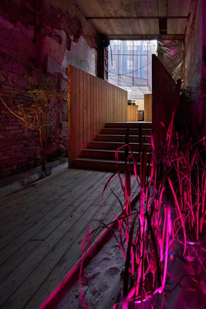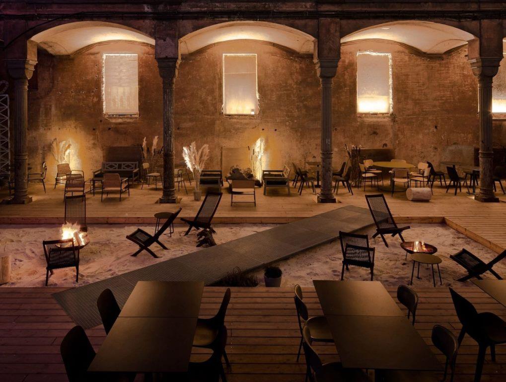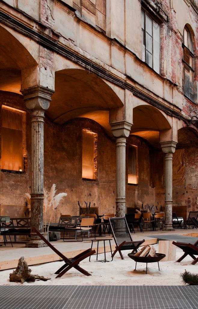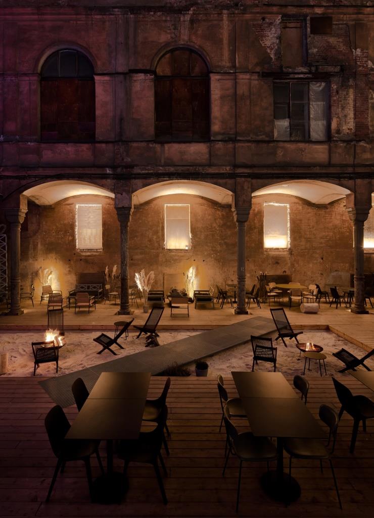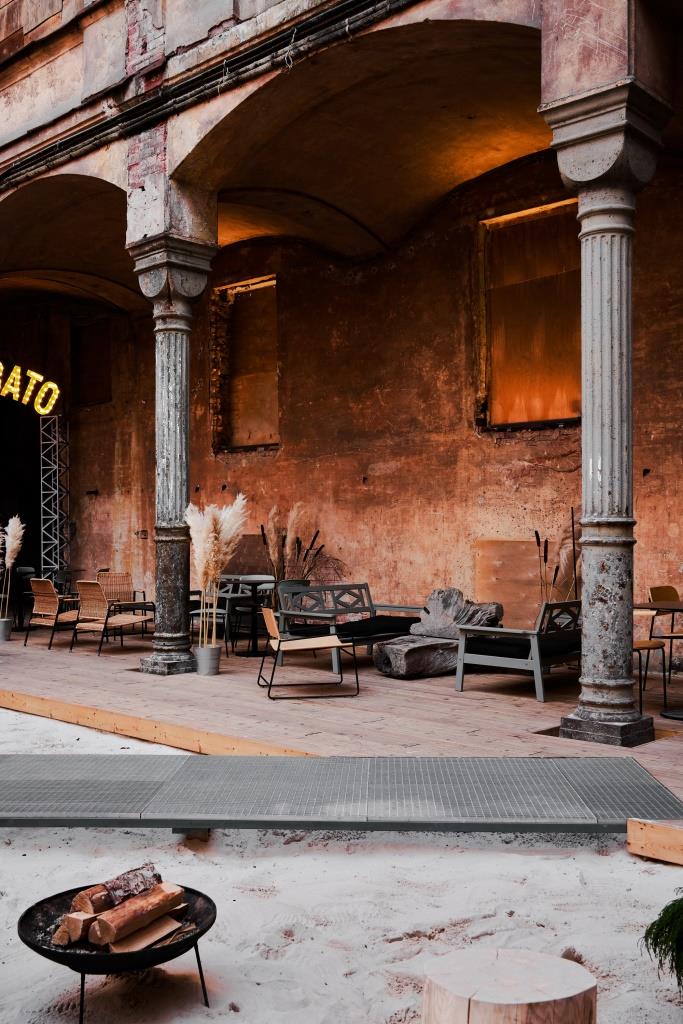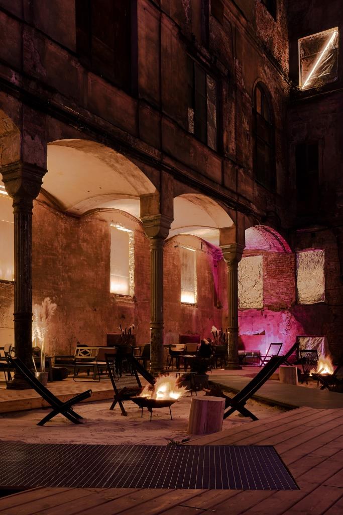 Strutture in legno richiamano alla mente l’immagine di un pontile proteso sul mare, mentre al centro della corte è stata ricreata una spiaggia in miniatura con sabbia, sdraio e un falò centrale che funge da punto di incontro e relazione. L’intero spazio della corte è contrappuntato da oggetti d’arte, insegne luminose ed elementi naturali come le canne di Finlandia usate in funzione decorativa.