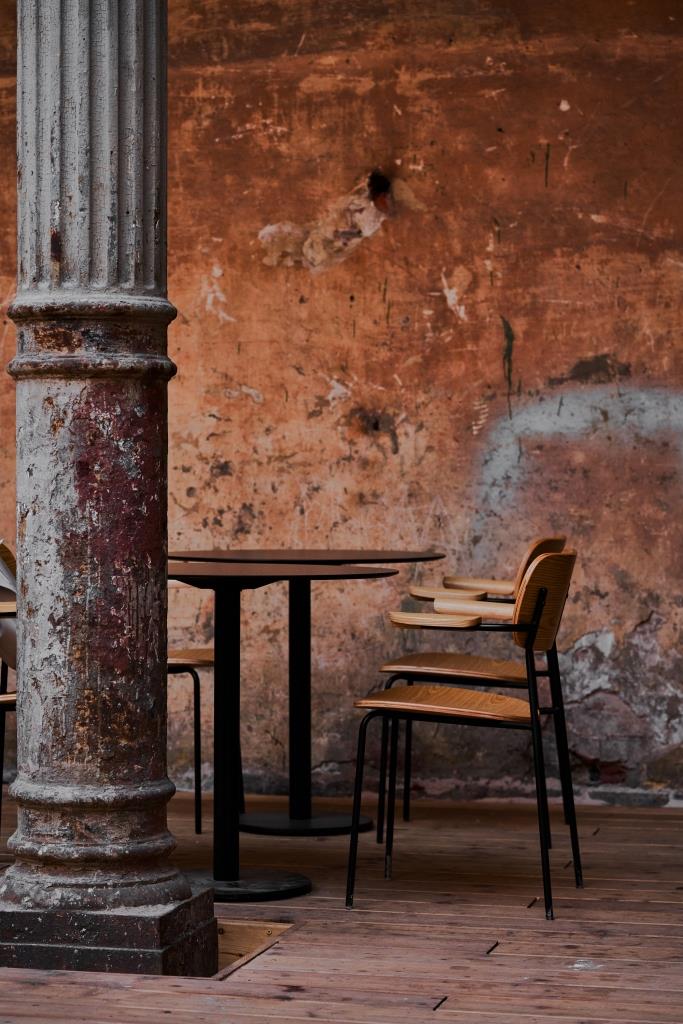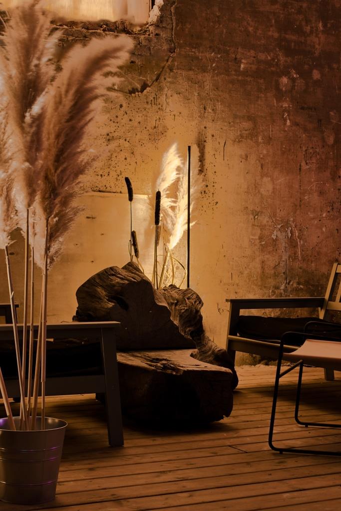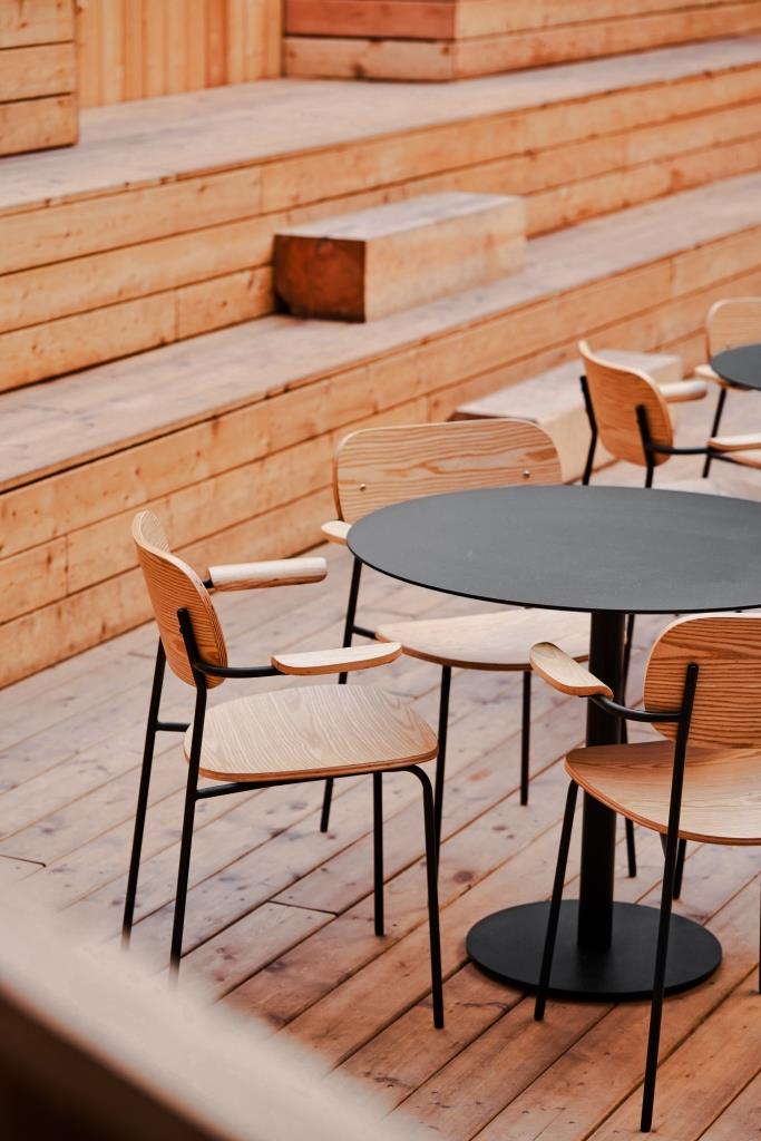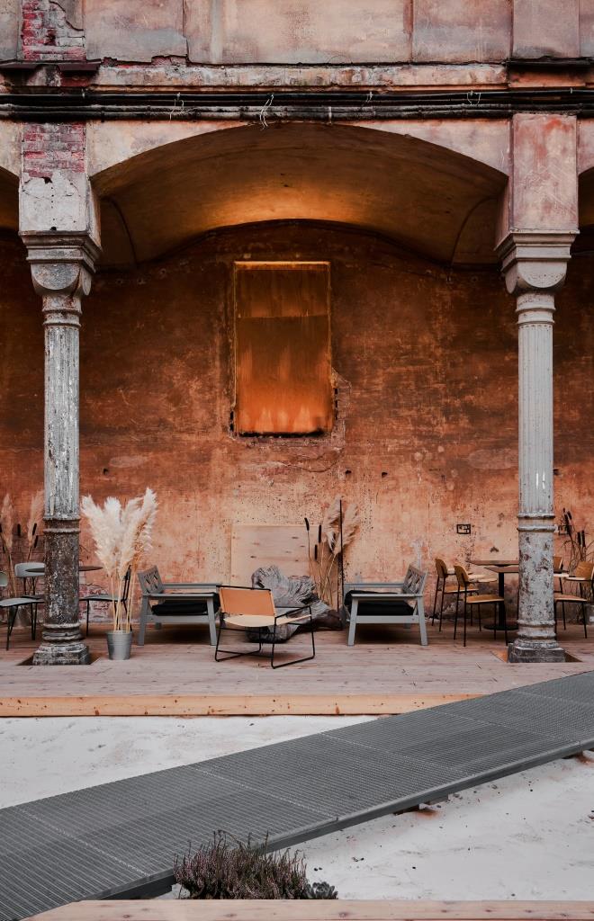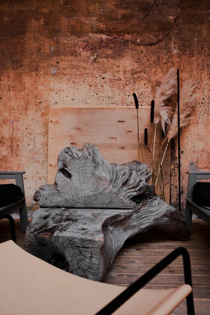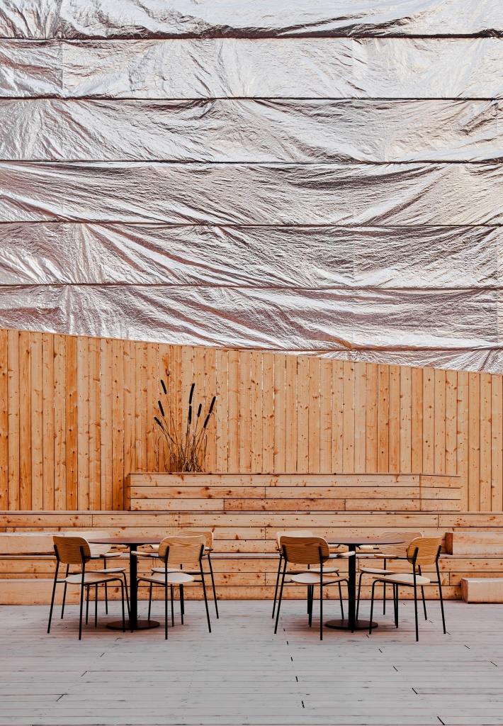Strutture in legno richiamano alla mente l’immagine di un pontile proteso sul mare, mentre al centro della corte è stata ricreata una spiaggia in miniatura con sabbia, sdraio e un falò centrale che funge da punto di incontro e relazione. L’intero spazio della corte è contrappuntato da oggetti d’arte, insegne luminose ed elementi naturali come le canne di Finlandia usate in funzione decorativa.