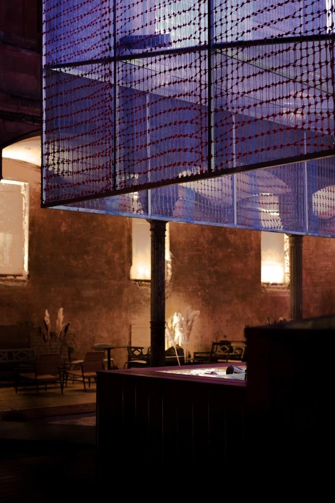 A fare da quinta a questo scenografico allestimento temporaneo è una delle facciate interne in ristrutturazione, occultata da una cortina riflettente che amplifica le luci provenienti da un grande cubo sospeso sopra l’area bar, una struttura leggera in metallo e cordame ispirata alle reti da pesca per sottolineare l’ambientazione marittima della location.