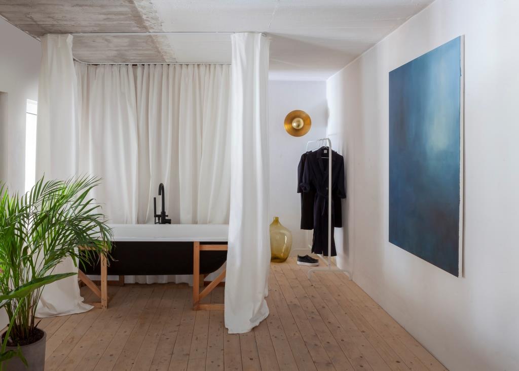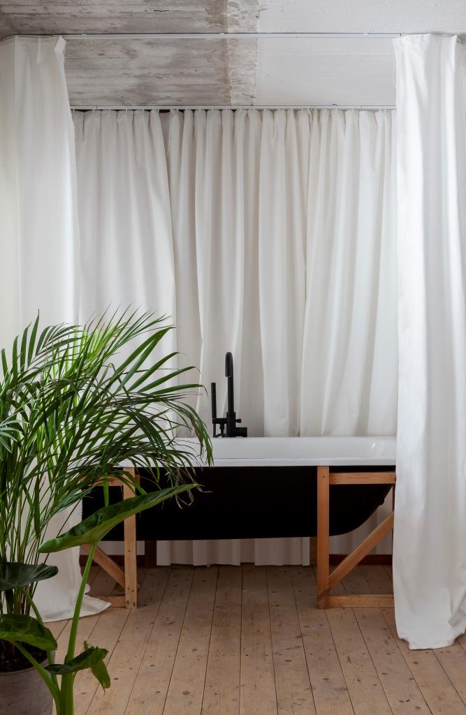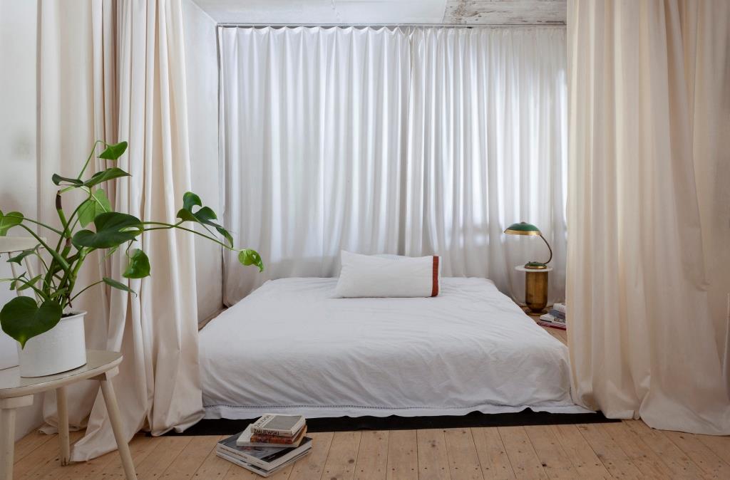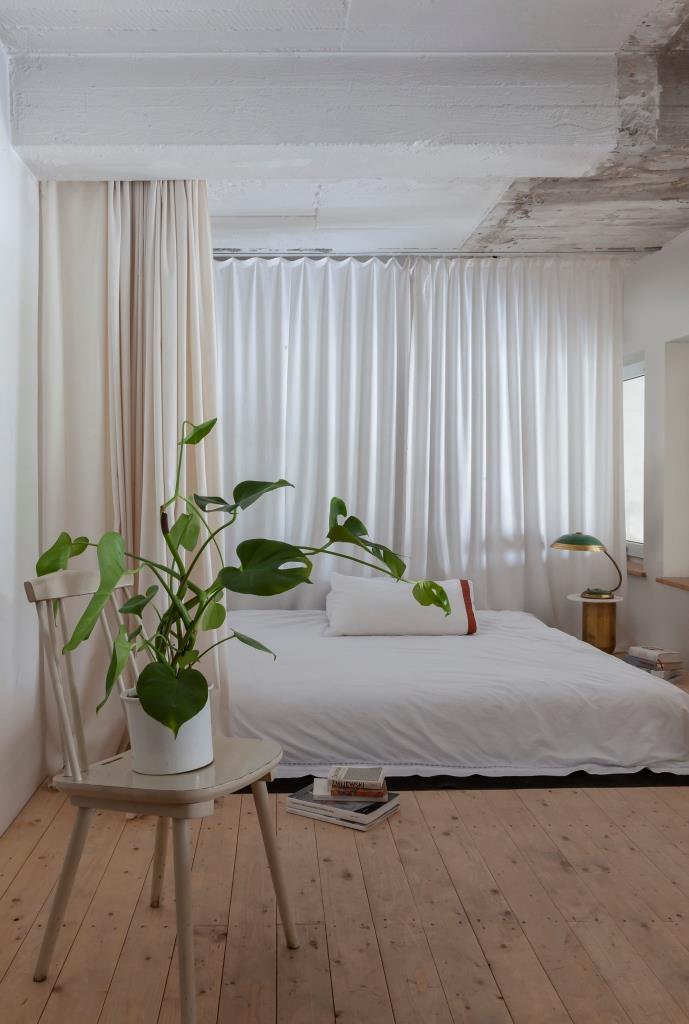 Una scala di legno conduce al soppalco dove è stata ricavata la camera da letto. In questo ambiente, più caldo, il pavimento è stato rivestito in legno chiaro. Il letto basso strizza l’occhio all’oriente, le privacy è garantita da un sistema di tendaggi morbidi che si chiudono all’occorrenza, gli stessi che schermano la vasca da bagno freestanding posta di fronte.