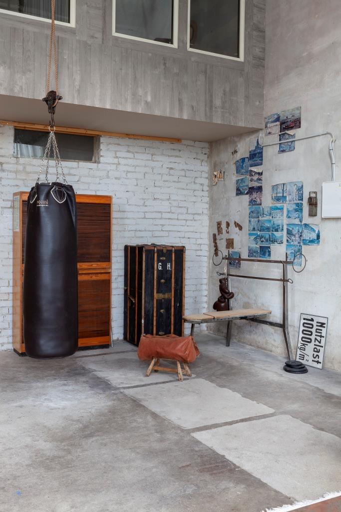 Sotto una delle finestre il delicato prototipo di una scrivania in vetro del padrone di casa individua l’home office, mentre sul lato opposto il tavolo da pranzo e un e un lungo piano di lavoro definiscono l’essenziale cucina. Vezzo originale, la scelta di realizzare un angolo fitness, con attrezzi vintage.