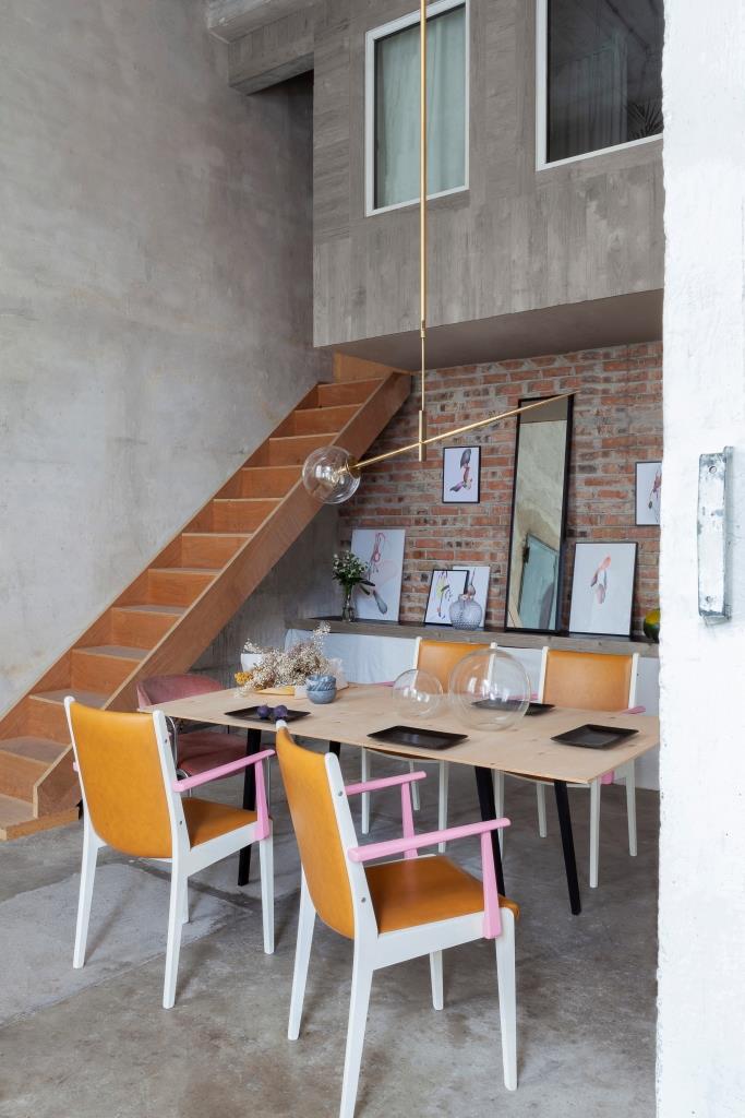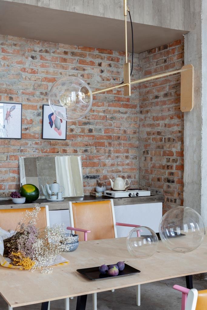 Ewelina e Jan hanno fermato i lavori di ristrutturazione e scelto di mantenere lo spazio in condizioni originali, ruvido e segnato dal tempo. I pavimenti in cemento grezzo, le paresti scrostate, i muri in mattoni rossi e le porte in metallo originali definiscono l’ambiente, luminosissimo grazie alle ampie finestre industriali e con soffitti alti ben cinque metri.