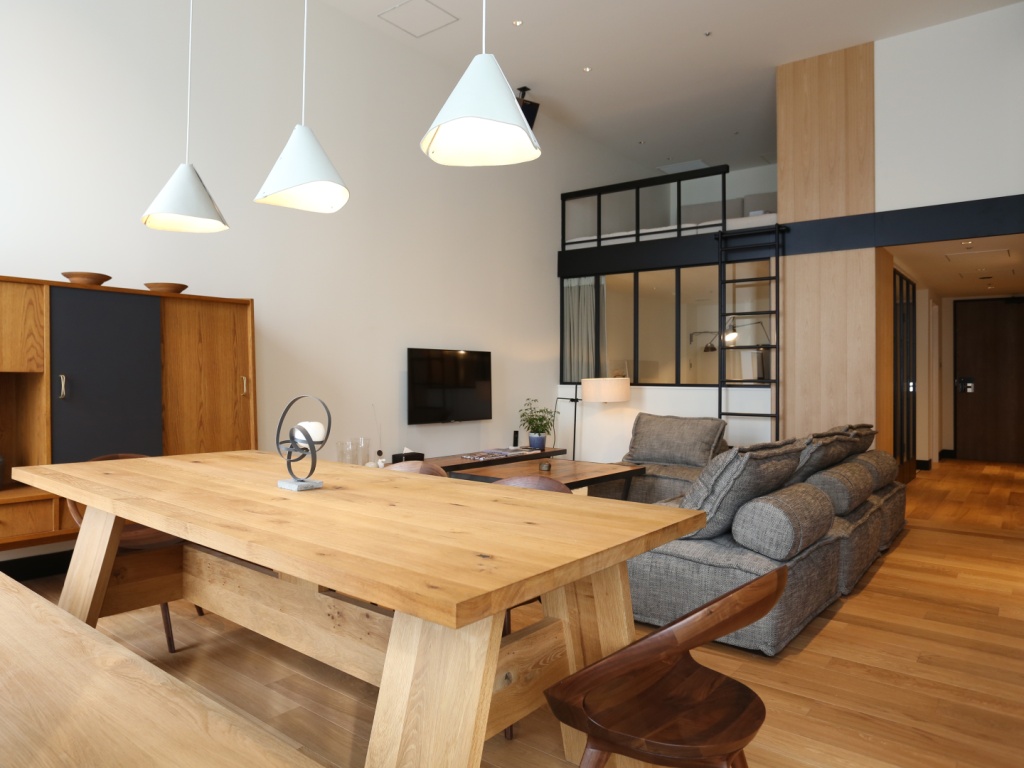 L’alternanza di pezzi di design internazionale e richiami alla tradizione nipponica continua nelle aree comuni. In soggiorno, infatti, i divani e le poltrone in pelle dell’americano Stephen Kenn dialogano con le lampade di Serge Mouille e con la celebre Potence, capolavoro di luce realizzato da Jean Prouvé nel 1950.