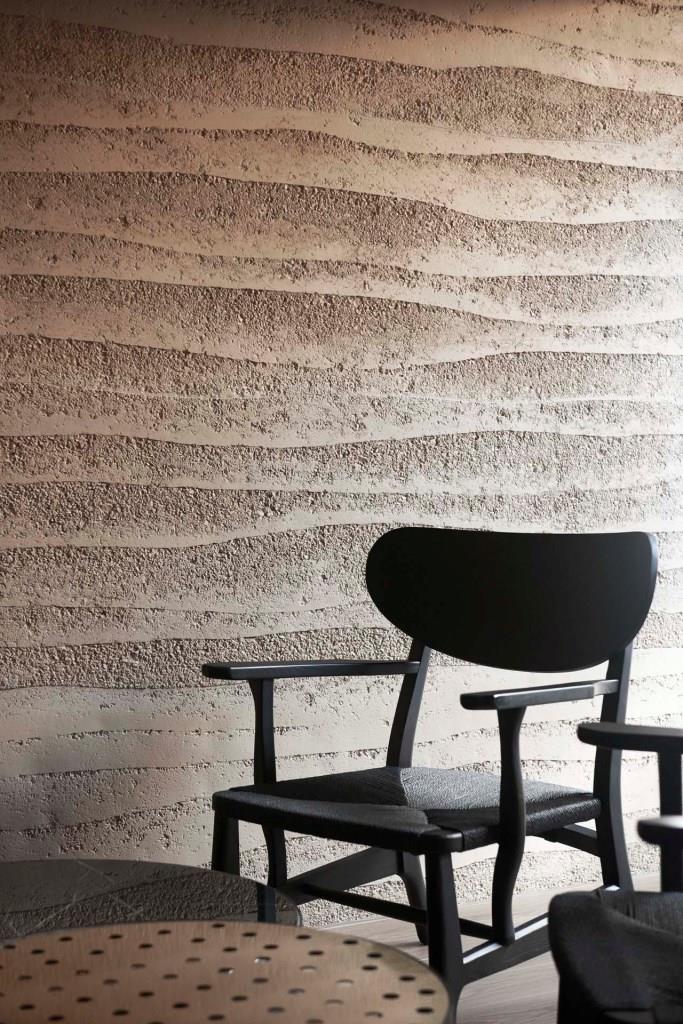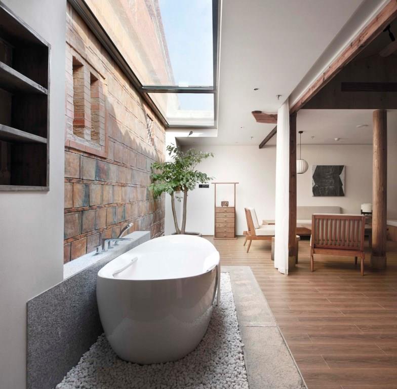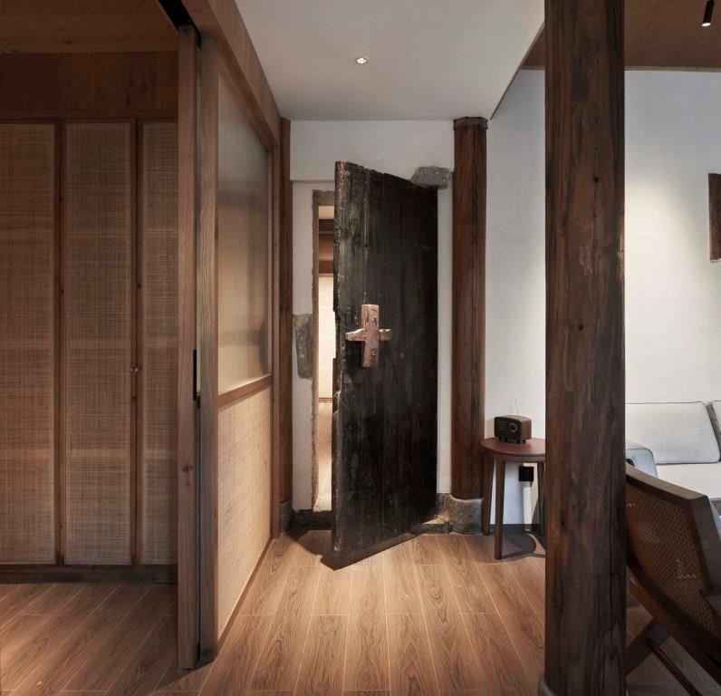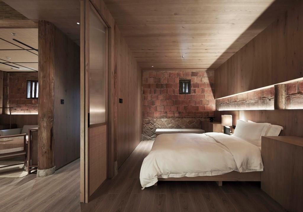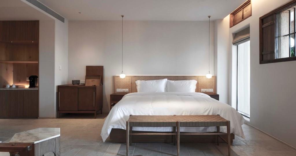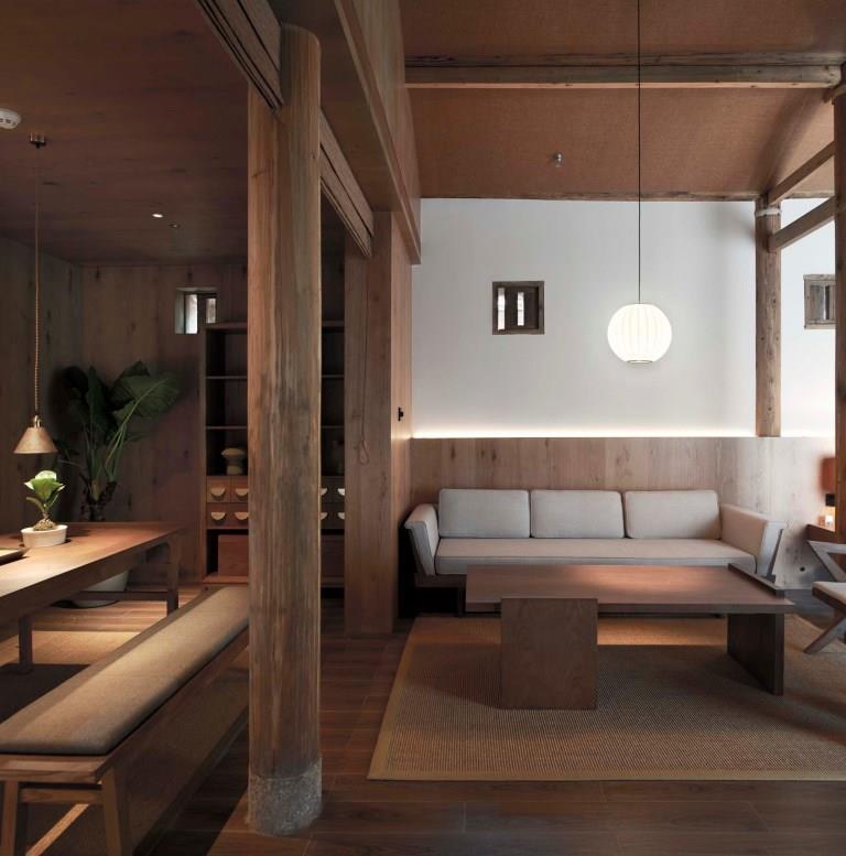 Il disegno degli interni è basato su una combinazione di legno, tinte tenui, stuoie e tessili naturali e riprende elementi architettonici degli edifici originali come i paramenti murari in mattoni, le porte e le colonne in legno, creando un originale mix con il design moderno di alcuni degli elementi d’arredo utilizzati.