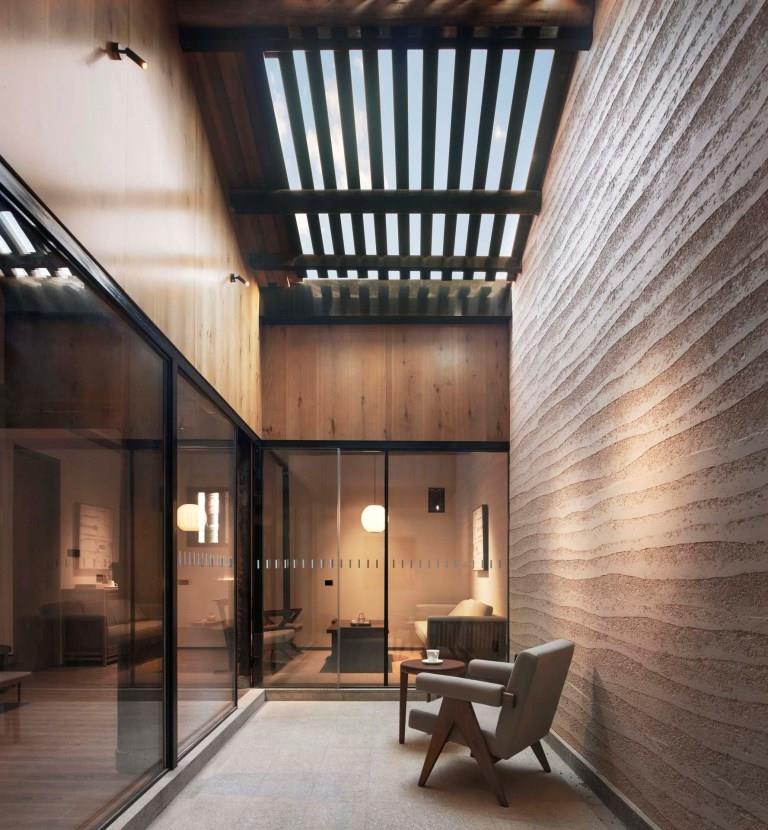 Oltre alle abitazioni il resort comprende una serie di spazi dedicati alla socialità come un ristorante e una suggestiva casa da the. Nel primo, un esteso uso di tecniche di progettazione moderne ha consentito di mantenere una piena coerenza formale con l’architettura e i materiali locali, mentre la seconda è stata concepita come spazio esperienziale che immerge l’ospite nelle raccolte atmosfere di un rito millenario grazie a arredi antichi e richiami ai colori e texture tipici della regione.