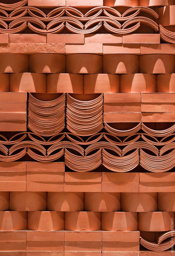 A terra, un mosaico policromo riprende la fantasia astratta di un tappeto azerbaigiano, mentre i muri sono rivestiti con tegole di terracotta rossa, alternativamente concave e convesse, posate come nelle case popolari delle metropoli asiatiche, lasciando solo alcuni spiragli per l’aria e la luce.