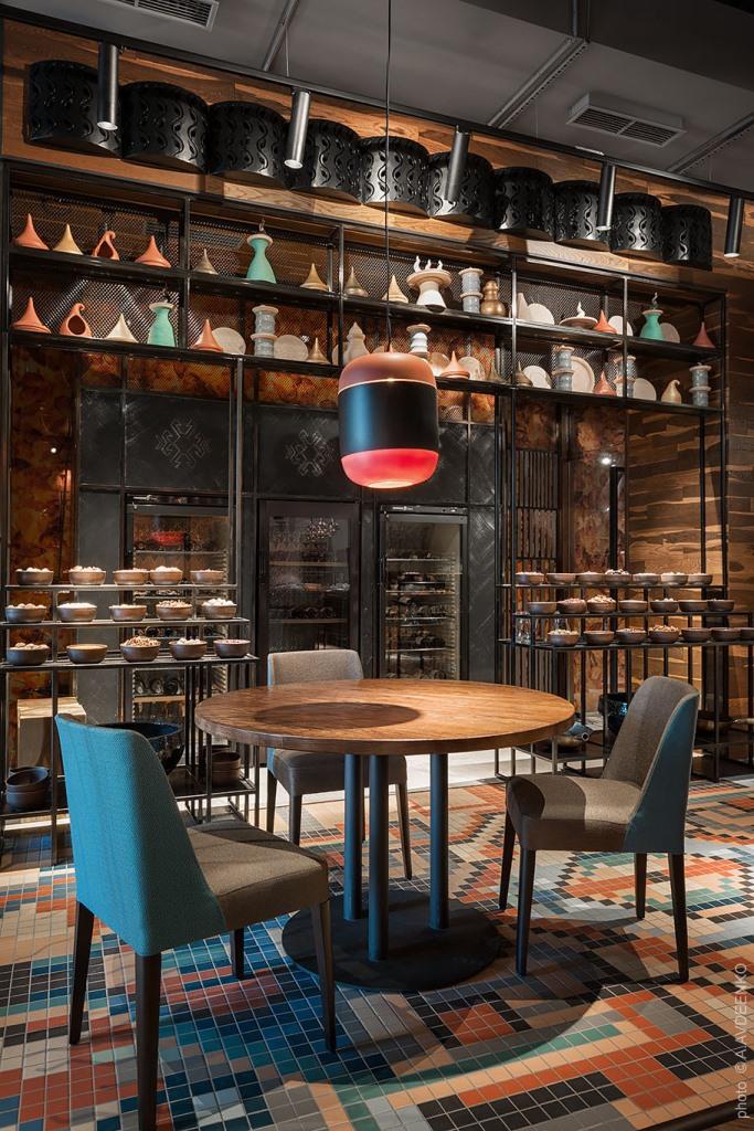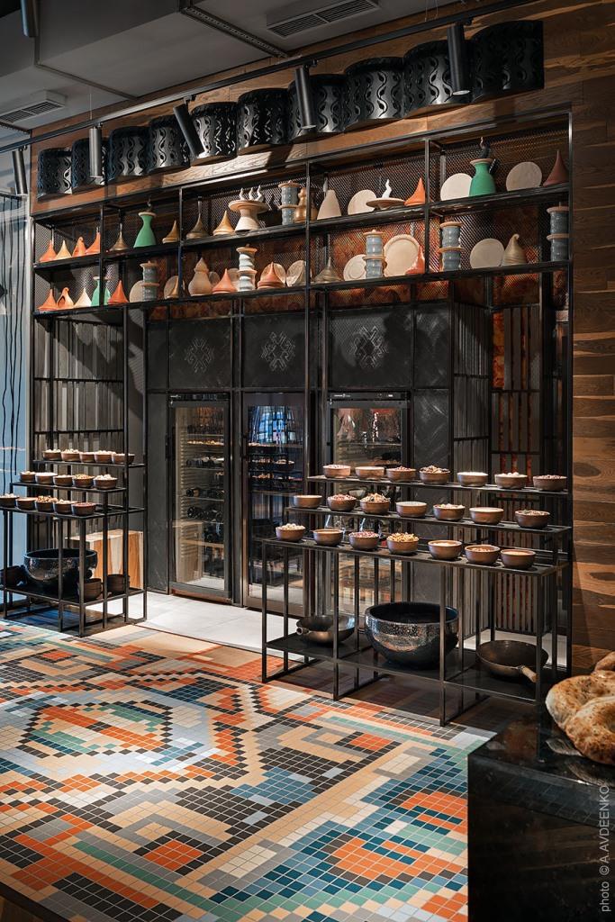 La combinazione di suggestioni e oggetti provenienti da differenti aree del Caucaso, dalla Turchia, dal Libano e dal Turkmenistan abita lo spazio attorno al forno tandori, cuore del locale e fulcro per la preparazione di molti dei piatti inseriti nell’eclettico menu.