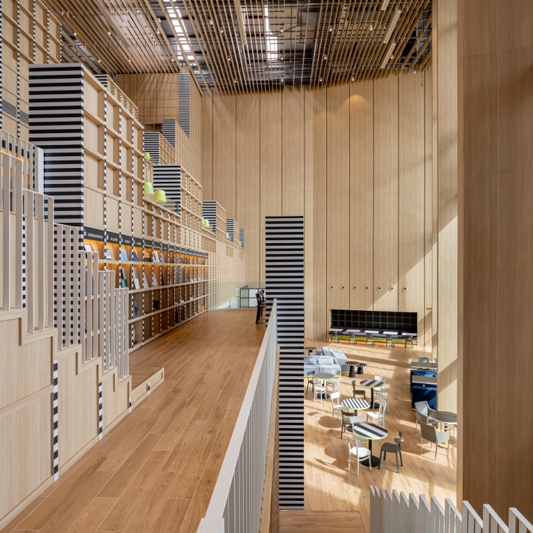 L’effetto è d’impatto, il legno si affianca a motivi a righe in bianco e nero, e ai piani più alti è garantita una maggiore privacy grazie alla presenza di una zona salotto attorniata da esemplari sospesi di tappeti, tende e carte da parati e di una sala espositiva con pareti ricoperte dal pavimento al soffitto di laminati in campioni formato A5 e nei colori più svariati, visibili tutti insieme in un colpo d’occhio.