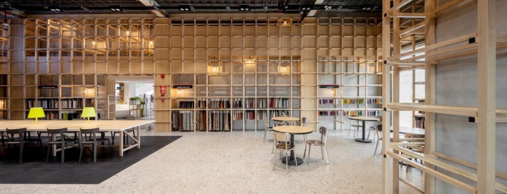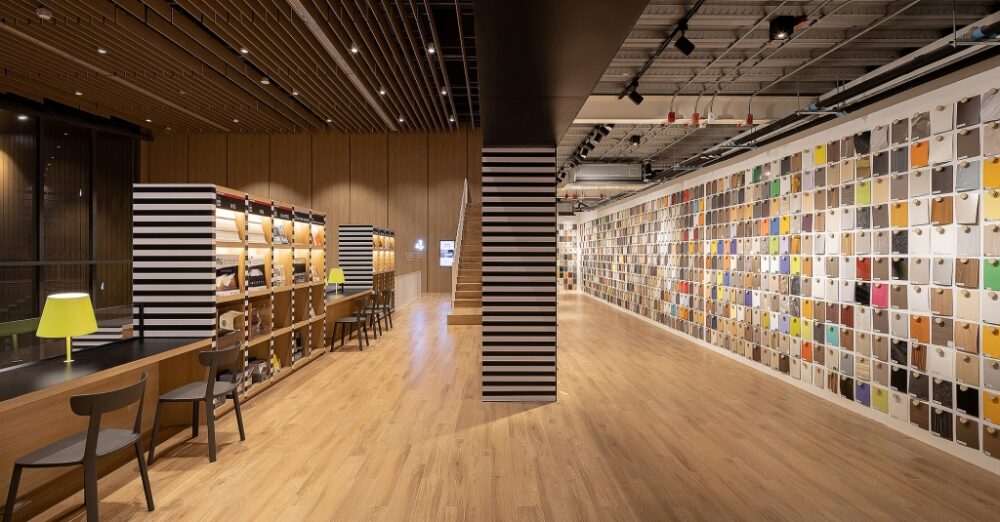 L’effetto è d’impatto, il legno si affianca a motivi a righe in bianco e nero, e ai piani più alti è garantita una maggiore privacy grazie alla presenza di una zona salotto attorniata da esemplari sospesi di tappeti, tende e carte da parati e di una sala espositiva con pareti ricoperte dal pavimento al soffitto di laminati in campioni formato A5 e nei colori più svariati, visibili tutti insieme in un colpo d’occhio.