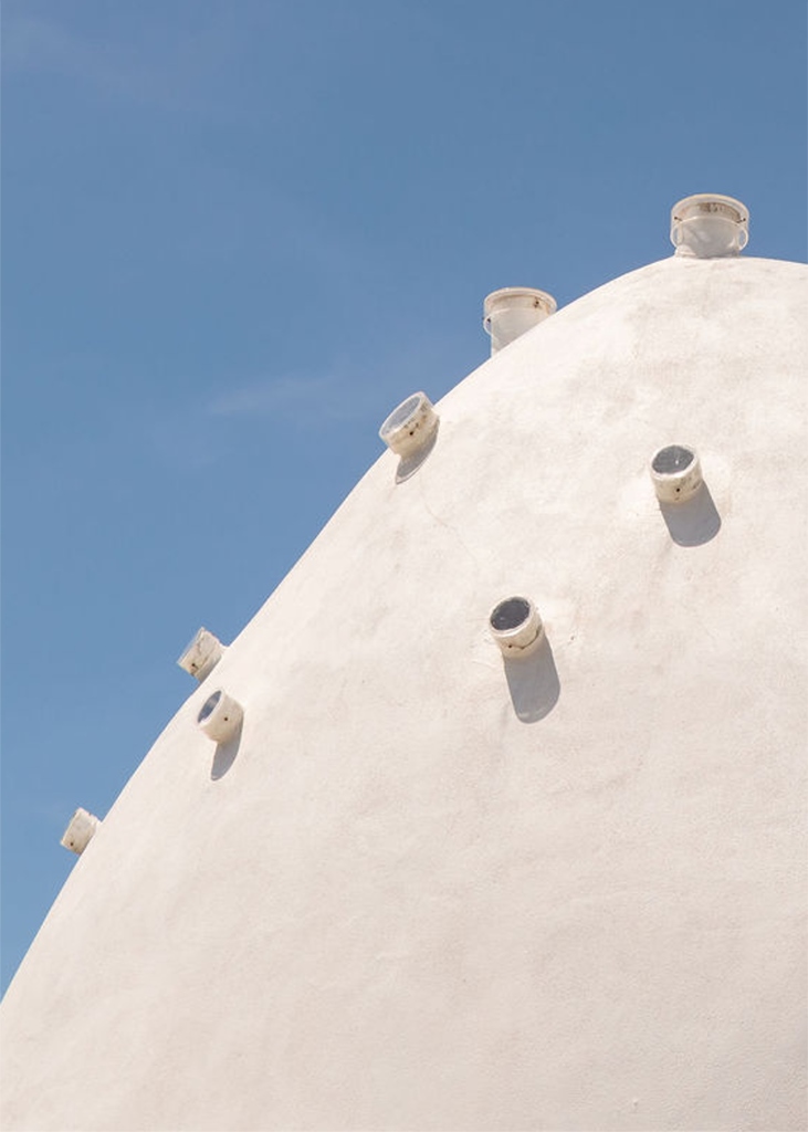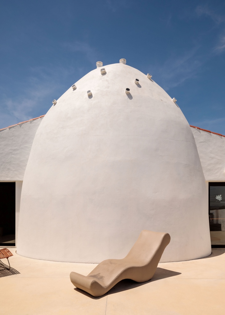 Nasce così il disegno di un’originale struttura a cupola nella quale è stata ricavata la camera calda dove immergersi nel vapore. All’esterno, la sala è ben distinguibile con la sua sagoma parabolica parzialmente incastrata sul fronte della fattoria, mentre all’interno l’ambiente è curvilineo e avvolgente – quasi a rievocare un accogliente ventre materno -, completamente rivestito di marmo e illuminato solo dai raggi che penetrano dalle aperture sulla sommità della copertura.