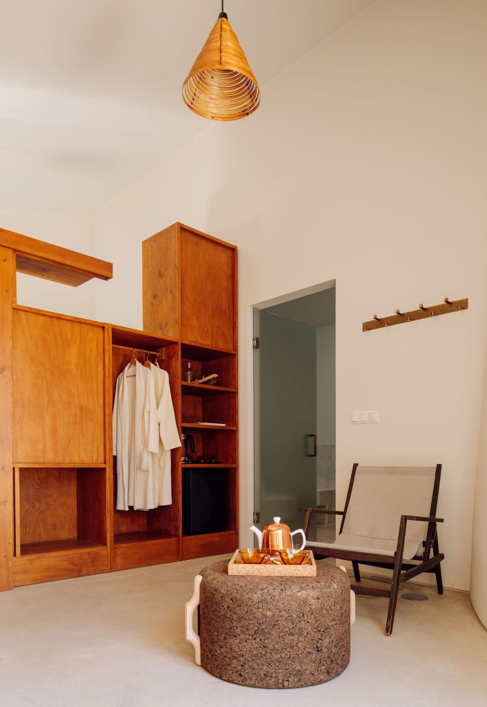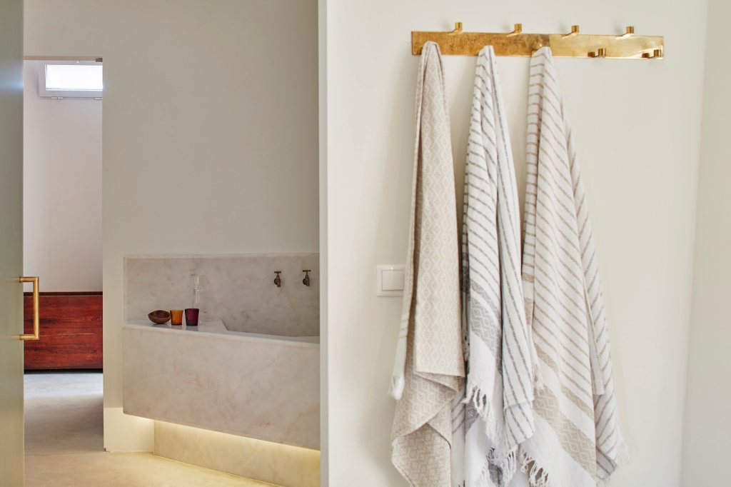 Anche qui generose panche in marmo si adeguano alla morfologia dello spazio creando una geometria calda e invitante, mentre scaffalature in legno dalle tinte profonde si affiancano a pezzi in pietra naturale, tessili in lino grezzo e lampadari in paglia intrecciata, creando un layout che affonda le sue radici nel passato ma con ricercati dettagli di inequivocabile contemporaneità.