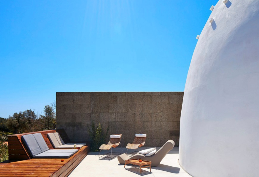Panche morbidamente curve rispecchiano la forma organica della stanza, e solo una vasca con rubinetti e soffione doccia rompe la compattezza levigata dei muri perimetrali. Il senso di intimità creato dalle forme curve prosegue nelle stanze adiacenti.
