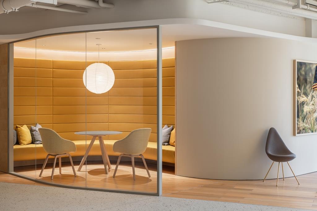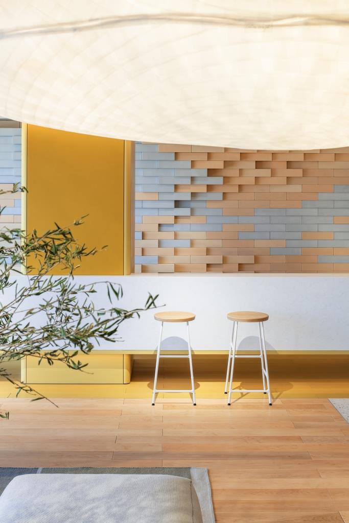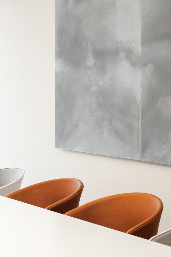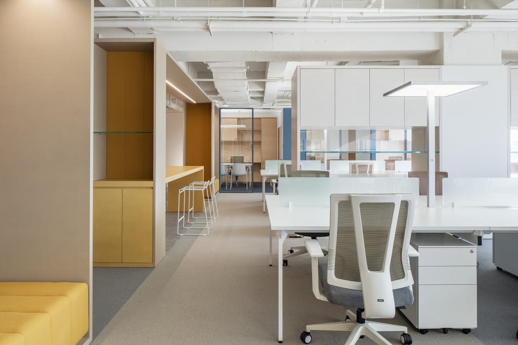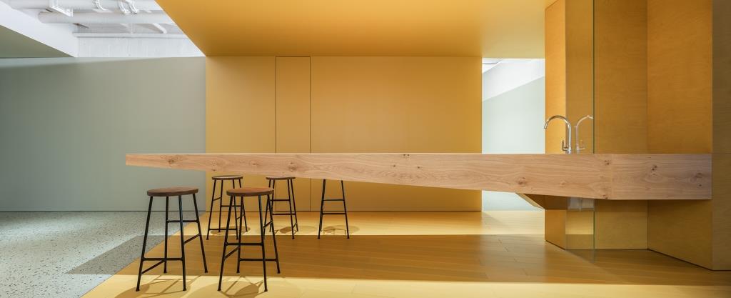 All’esterno della meeting room, un’area break segna un cambio di passo cromatico declinandosi nelle tonalità del giallo e nel calore di un ampio tavolo sospeso in legno, che funge anche da elemento di separazione dei percorsi interni.