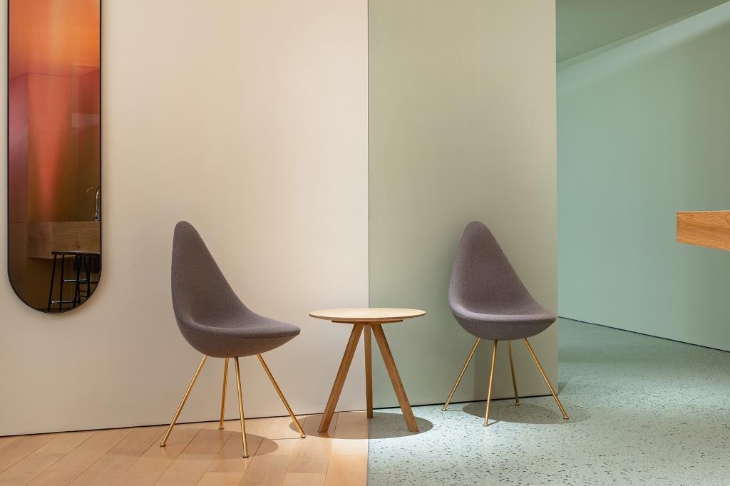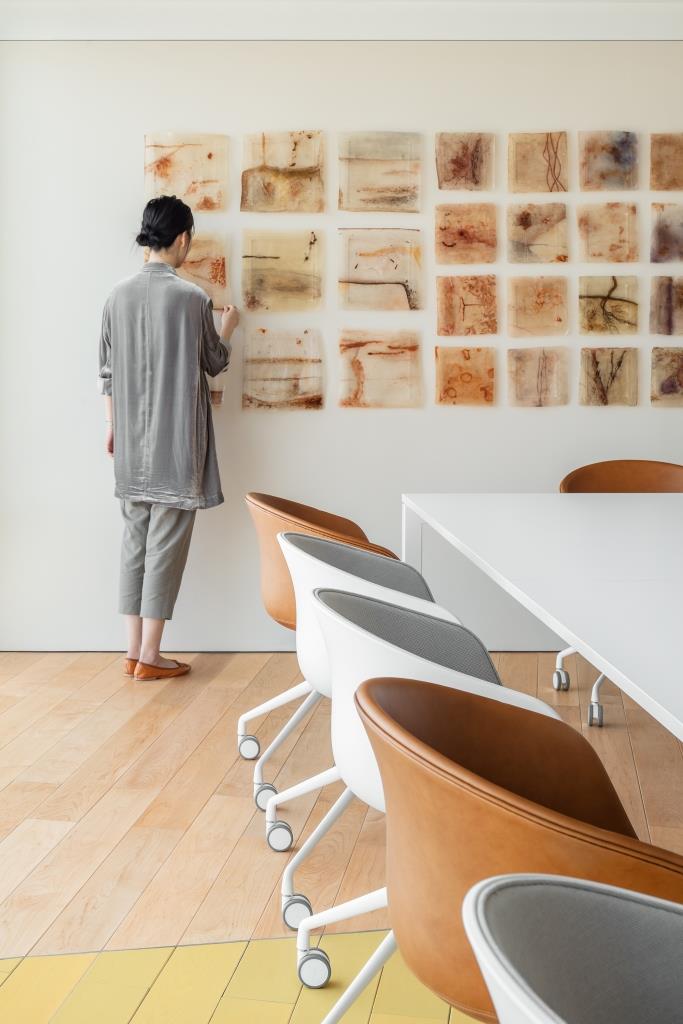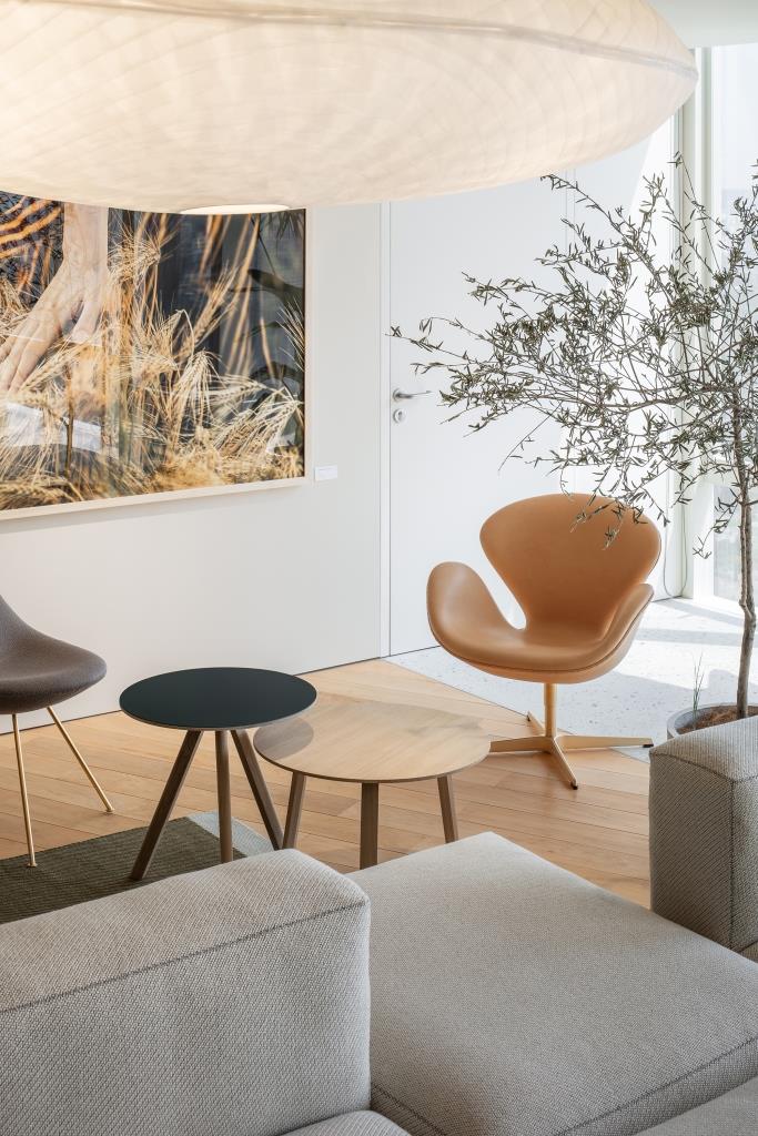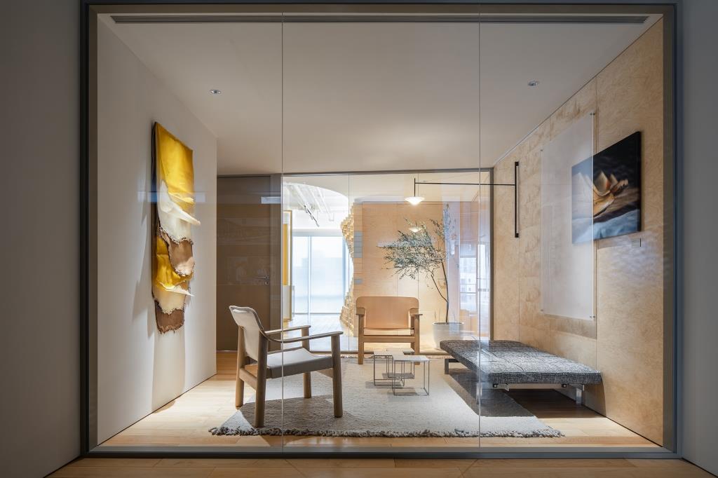 Accanto all’area reception, una intima lounge è valorizzata da creazioni in pelle ispirate alle marionette – ombra Shaanxi, la cui essenzialità esprime un ideale crossover fra la cultura cinese e le origini danesi del marchio.