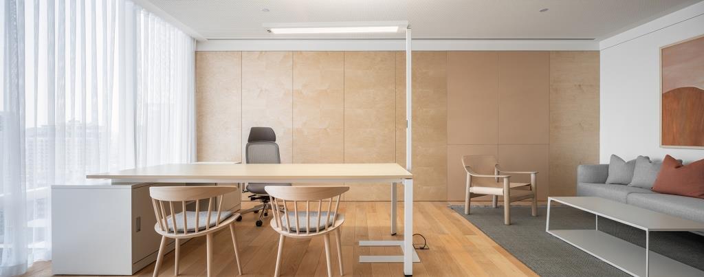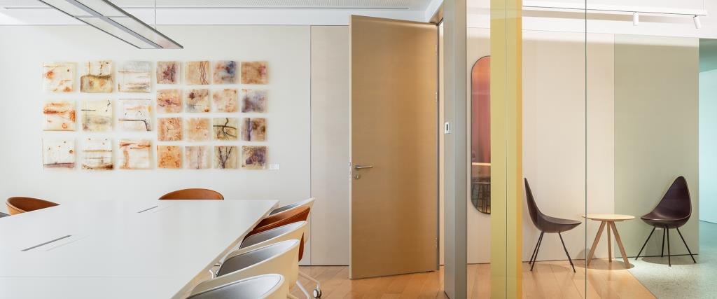 Gli open space che ospitano le postazioni di lavoro, scanditi da un’alternanza di colori tenui, creano un ambiente energico e stimolante, e sono visivamente collegati agli uffici privati tramite vetrate la cui trasparenza crea un senso di continuità spaziale.