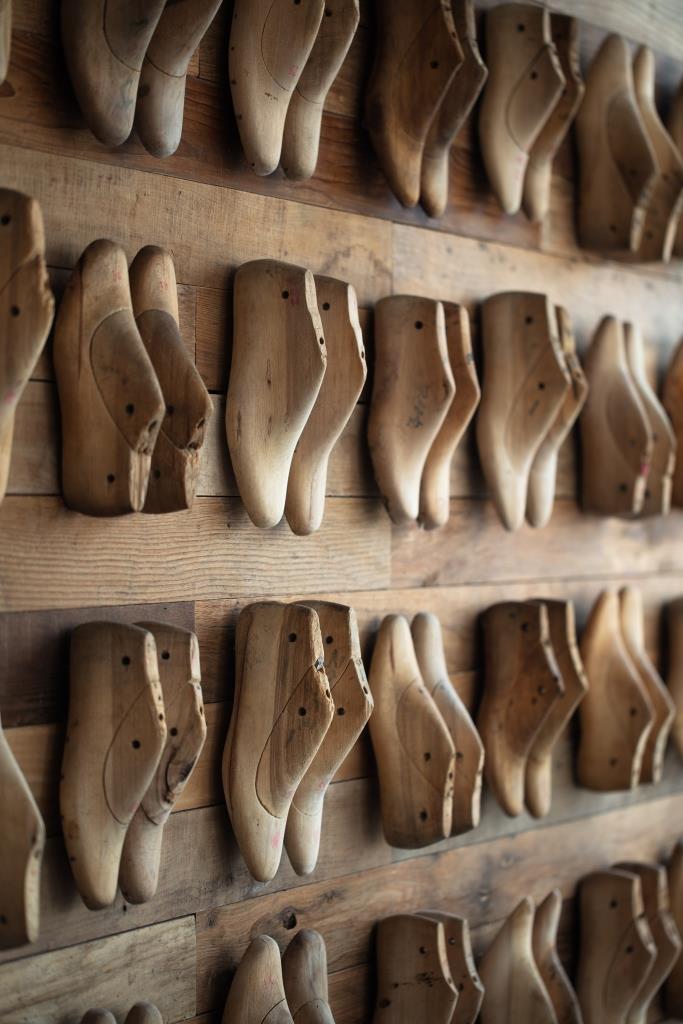 Nuovi scenari anche per l’adiacente sala VIP, dove la lineare essenzialità già vista nell’area reception è arricchita dall’esposizione a parete di modelli in legno utilizzati per la creazione delle calzature, quasi un’opera d’arte concettuale che si richiama alla tradizione artigianale del brand.