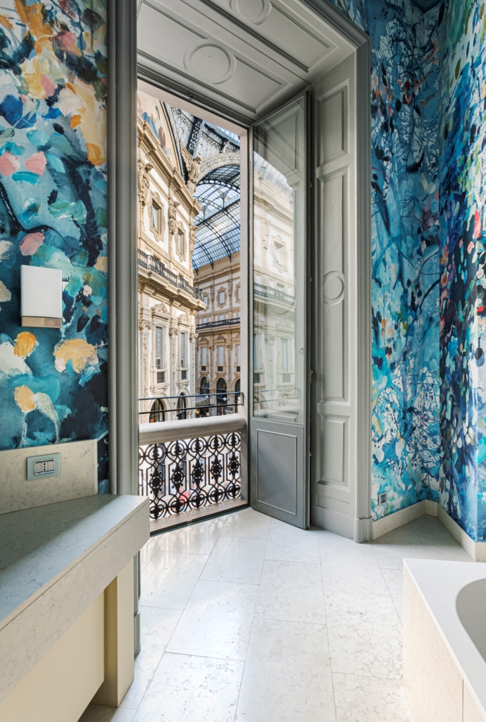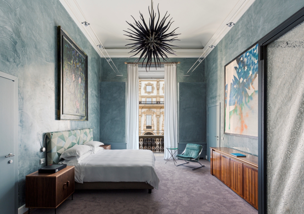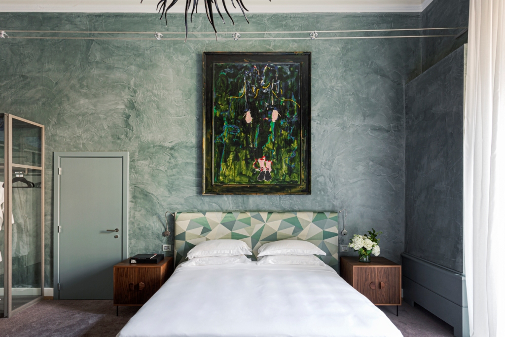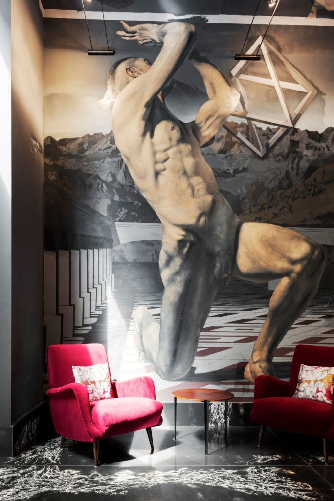Un ingresso spettacolare che, però, è solo un’anteprima, perché anche nelle stanze gli artisti hanno realizzato opere site specific dando vita a un’esperienza d’arte immersiva. In ogni ambiente murales e affreschi, principalmente ispirati all’arte italiana, affiancano un’ampia collezione d’arte internazionale e una selezione di arredi di design con pezzi, tra gli altri, di Gio Ponti, Franco Albini e Ico Parisi.