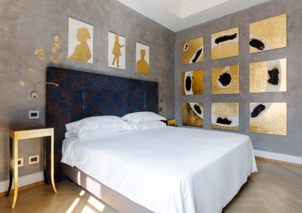 Un ingresso spettacolare che, però, è solo un’anteprima, perché anche nelle stanze gli artisti hanno realizzato opere site specific dando vita a un’esperienza d’arte immersiva. In ogni ambiente murales e affreschi, principalmente ispirati all’arte italiana, affiancano un’ampia collezione d’arte internazionale e una selezione di arredi di design con pezzi, tra gli altri, di Gio Ponti, Franco Albini e Ico Parisi.