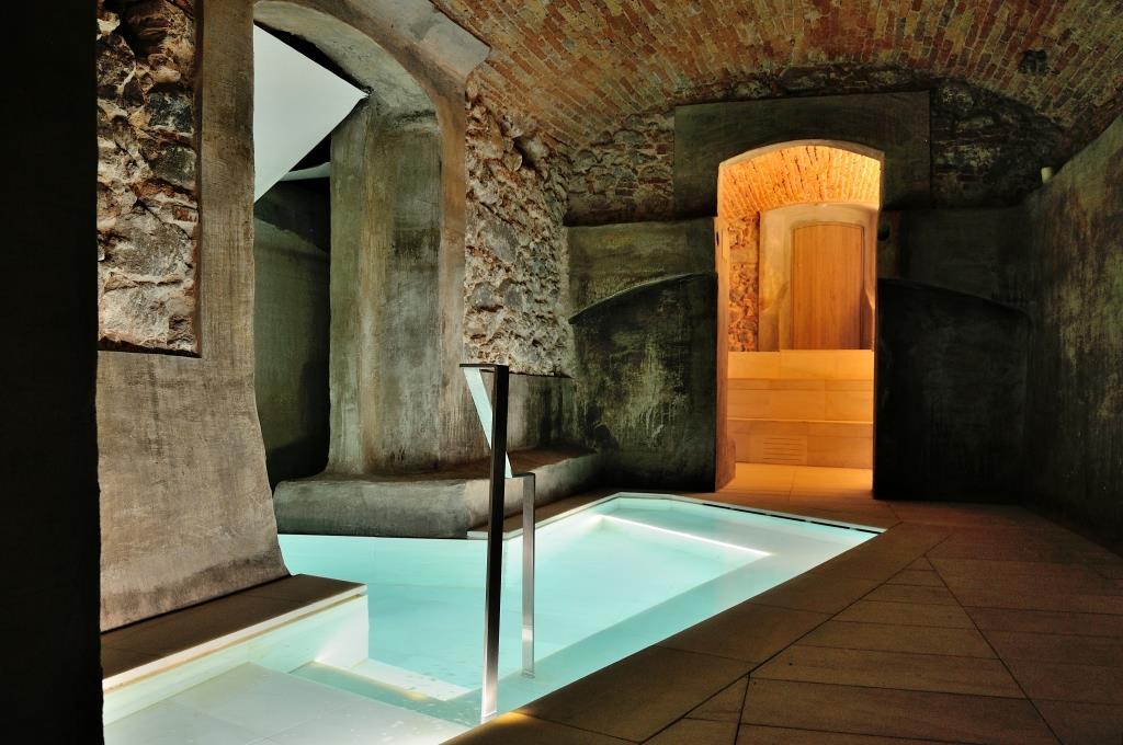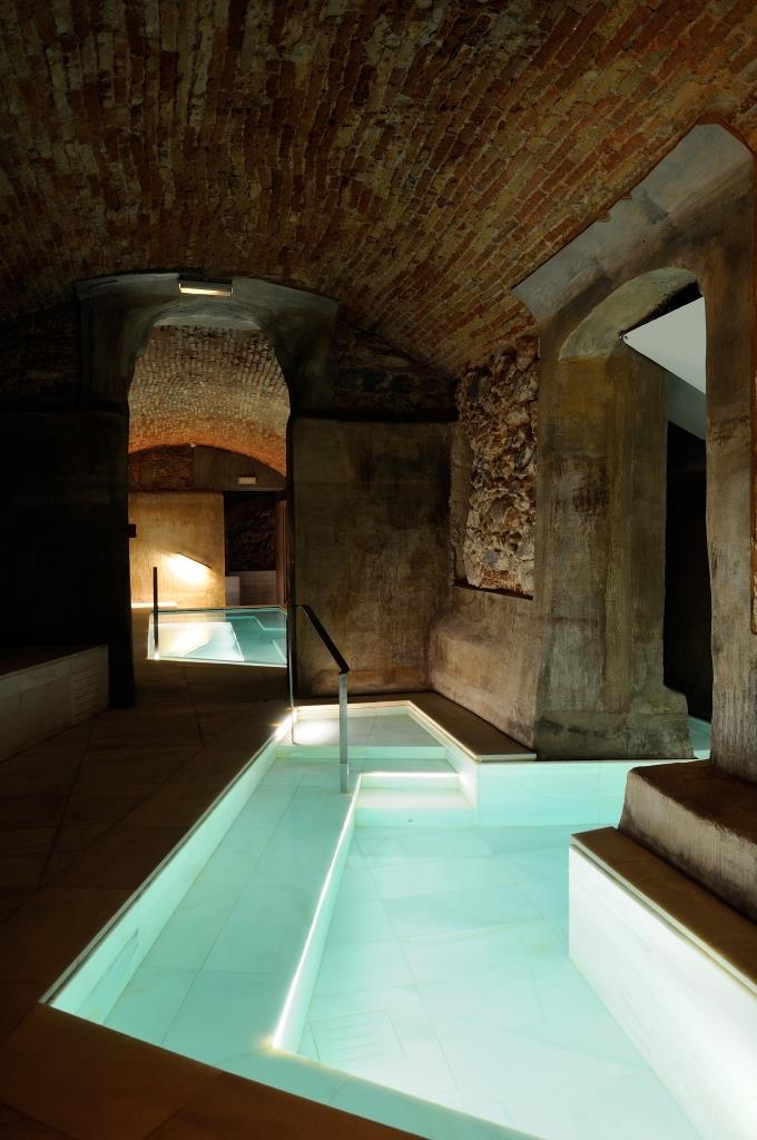 Il nuovo centro benessere si sviluppa dunque in una porzione dei sotterranei dell’hotel attigua alla zona termale tradizionale, in un’area finora chiusa al pubblico, e converte i depositi in sette vasche termali, con annesse docce e servizi accessori. Maria Almirall dello studio Arquetipus ha puntato tutto sulla conservazione dello stato originario delle strutture, che se da un lato ne ha fortemente condizionato il progetto, è anche il suo grande segno distintivo. I lavori sono stati di non facile esecuzione, con l’hotel a regime e le strutture della nuova zona benessere che ne costituiscono le fondamenta.