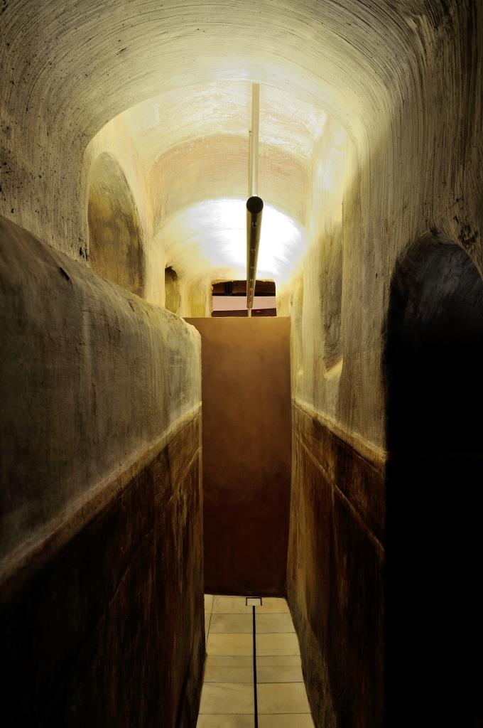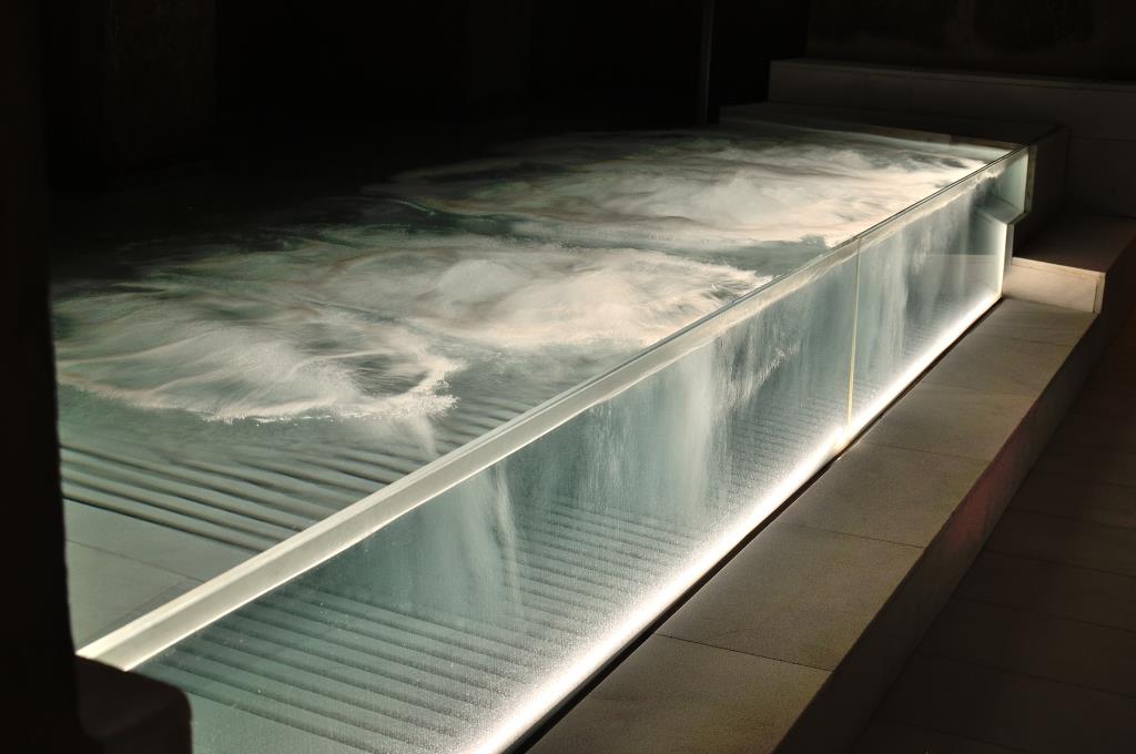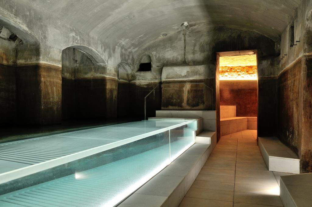 La scoperta di un corso d’acqua sotterraneo ha obbligato a deviare le canalizzazioni dell’acqua termale verso le nuove installazioni ed è stato necessario trasferire e sostituire alcune di quelle che servono la zona preesistente dei trattamenti. Per conservare l’impronta che la storia ha lasciato in questo spazio la progettista ha agito con sensibilità e grande attenzione ai materiali. L’intervento si fonde con le preesistenze, mantenendo un profilo neutro, per lasciare il protagonismo alla pietra dei muri e alle volte rivestite in mattoni originali.