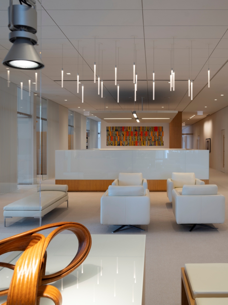 E’ proprio il tracciato di Chicago, con le sue sorprese, che abbiamo pensato di proiettare all’interno di questo spazio: si passeggia tra pezzi di arte contemporanea sorpresi di tanto in tanto da colori forti o da doppie altezze insolite per un grattacielo, guidati dal ritmo serrato delle pareti, dalla luce e dagli assi visuali. Il primo input, infatti, è stato proprio privilegiare questi ultimi e lasciare gli angoli liberi per mantenere sempre il contatto visivo con la città”