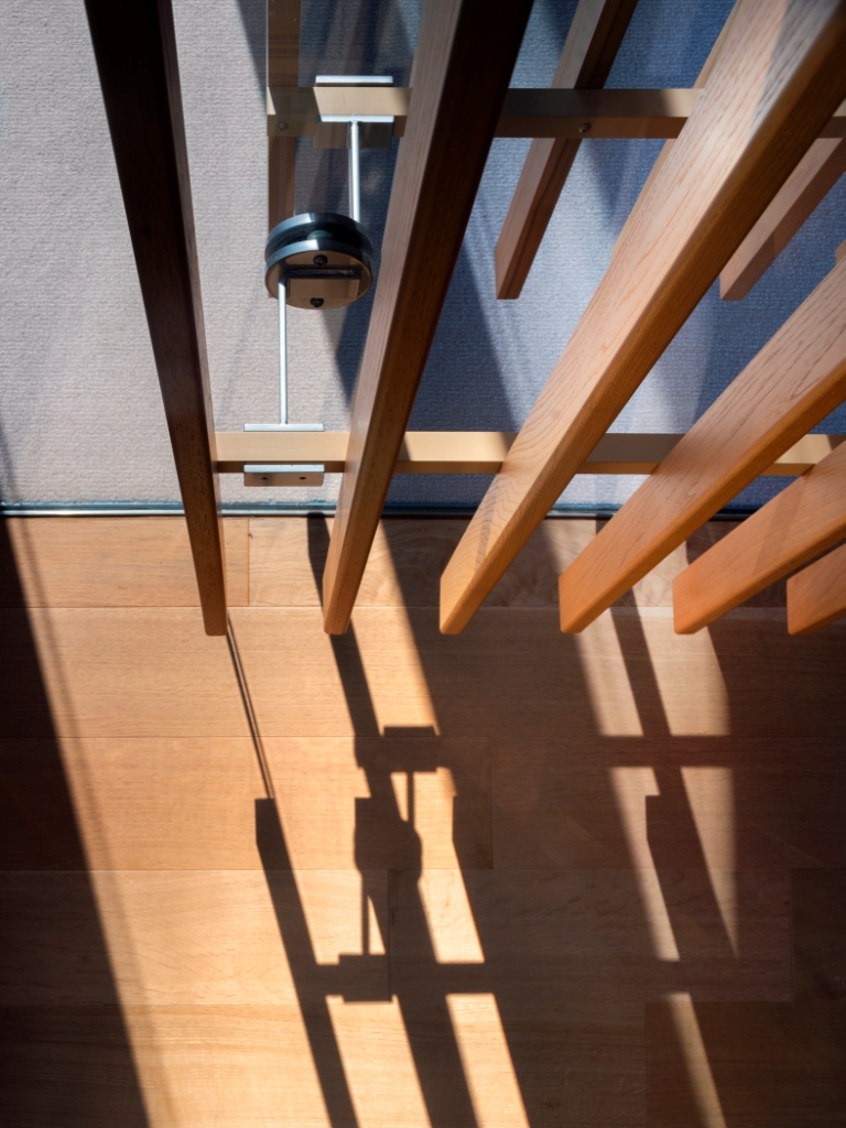 A seconda dei punti di vista, la pelle del Winter Garden, composta da due file di listelli lignei sospesi e non allineati fra loro, con un vetro trasparente posto nel mezzo, si dissolve o diventa opaca, generando molteplici punti di vista e un interessante gioco di luci e ombre. Completano la stanza una scultura sospesa in bambù, creata su commissione dall’artista giapponese Ueno Masao, e il tavolo disegnato da Junko Kirimoto, con finitura in lacca giapponese. Lo spazio ha un tocco orientale e proporzioni sapientemente misurate, in linea con le sensibilità italiane e giapponesi che animano lo studio.