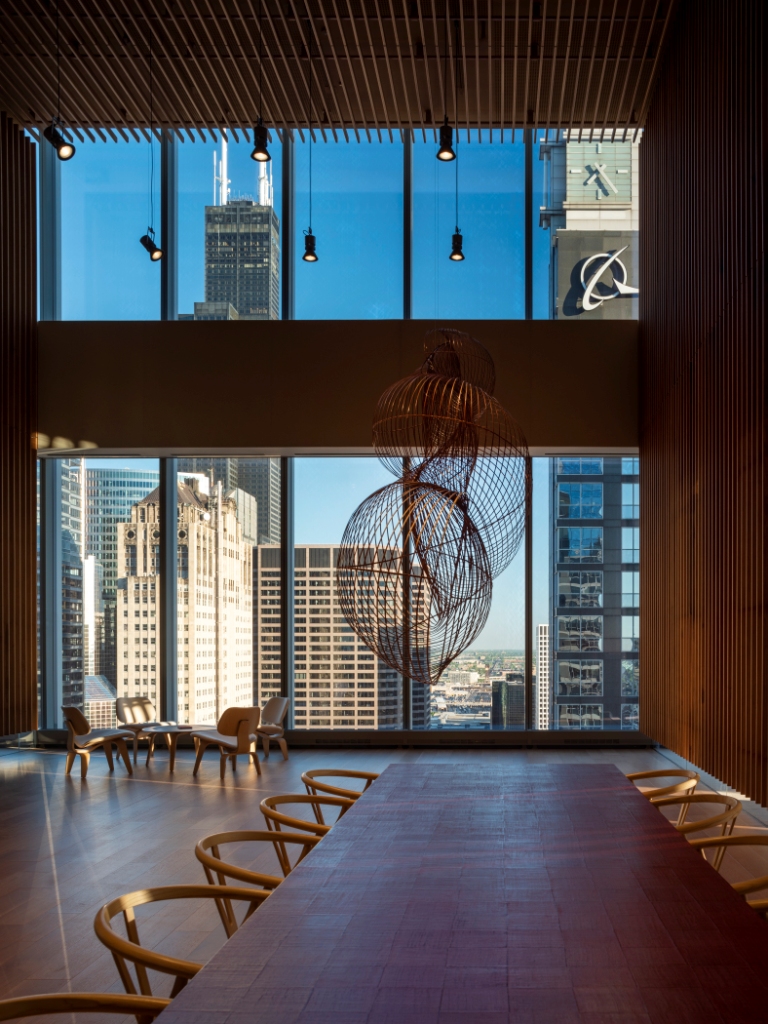 Alvisi Kirimoto trasforma il 32mo piano di un grattacielo a Chicago, oggi headquarter del committente. Pareti di legno, che si smaterializzano in lamelle verticali per calibrare il grado di privacy e luminosità, sono le principali direttrici del progetto