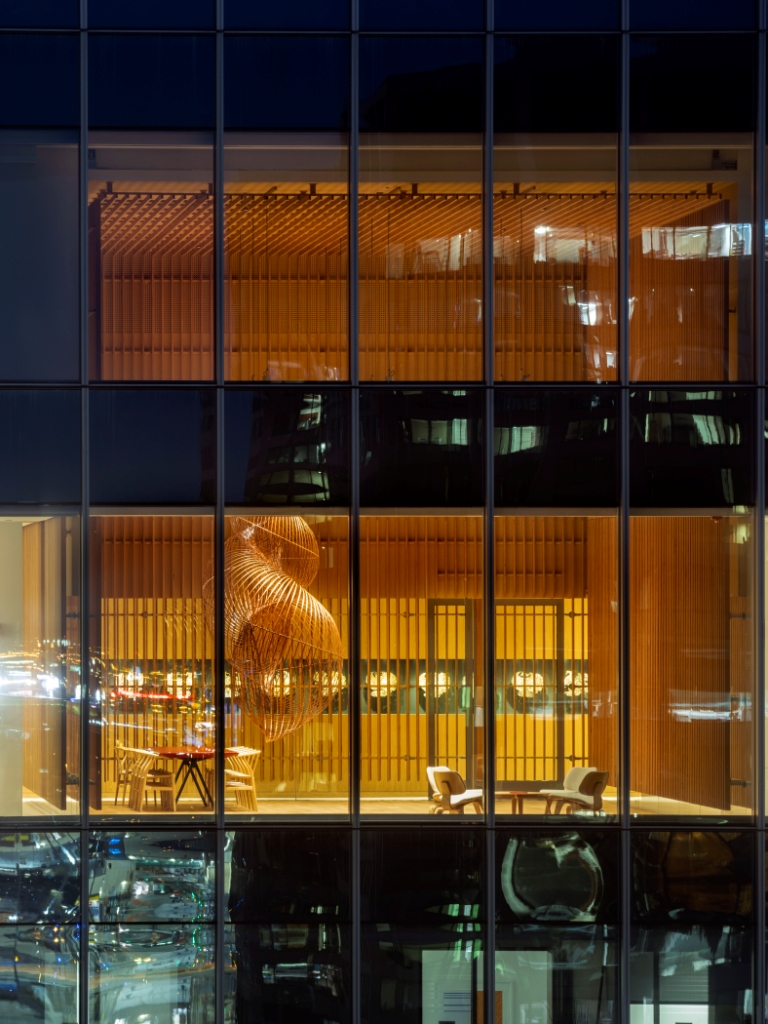 Gli interni sono caratterizzati da pareti in legno naturale a tutta altezza, partizioni vetrate e pannelli sospesi, che delineano le diverse aree di lavoro. La grande flessibilità e trasparenza degli elementi consente a visitatori e impiegati di godere di panorami mozzafiato anche negli ambienti più privati delimitati da superfici opache. Pareti di legno, che si smaterializzano in lamelle verticali per calibrare il grado di privacy e di luminosità, caratterizzano le principali direttrici del progetto, un leitmotiv che accompagna il visitatore fino alla scoperta del Winter Garden, un ambiente polifunzionale a doppia altezza che rappresenta il cuore pulsante del progetto.
