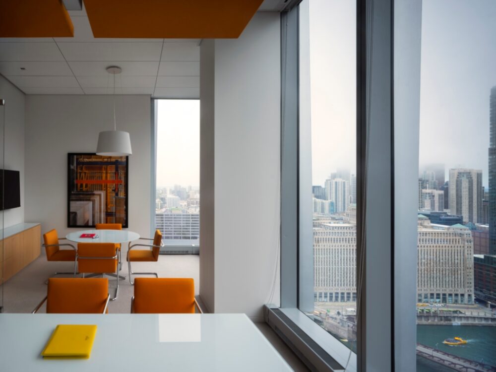 E’ proprio il tracciato di Chicago, con le sue sorprese, che abbiamo pensato di proiettare all’interno di questo spazio: si passeggia tra pezzi di arte contemporanea sorpresi di tanto in tanto da colori forti o da doppie altezze insolite per un grattacielo, guidati dal ritmo serrato delle pareti, dalla luce e dagli assi visuali. Il primo input, infatti, è stato proprio privilegiare questi ultimi e lasciare gli angoli liberi per mantenere sempre il contatto visivo con la città”