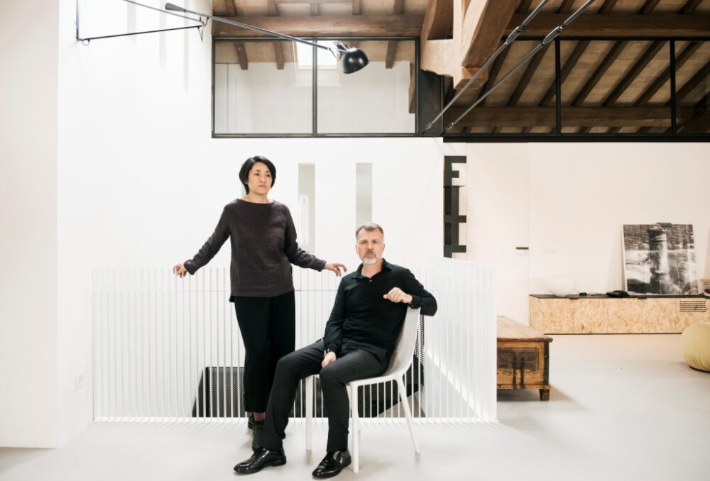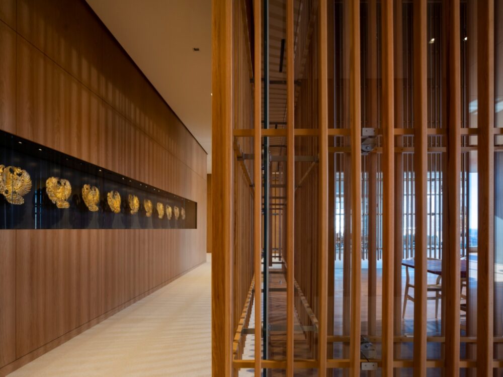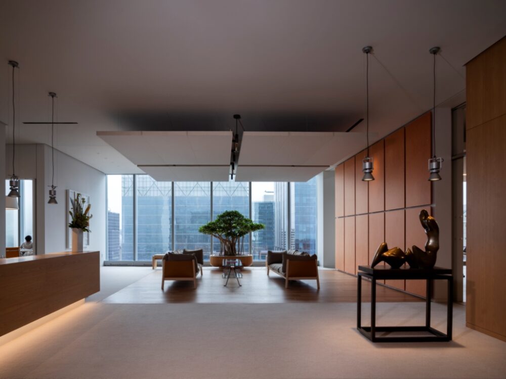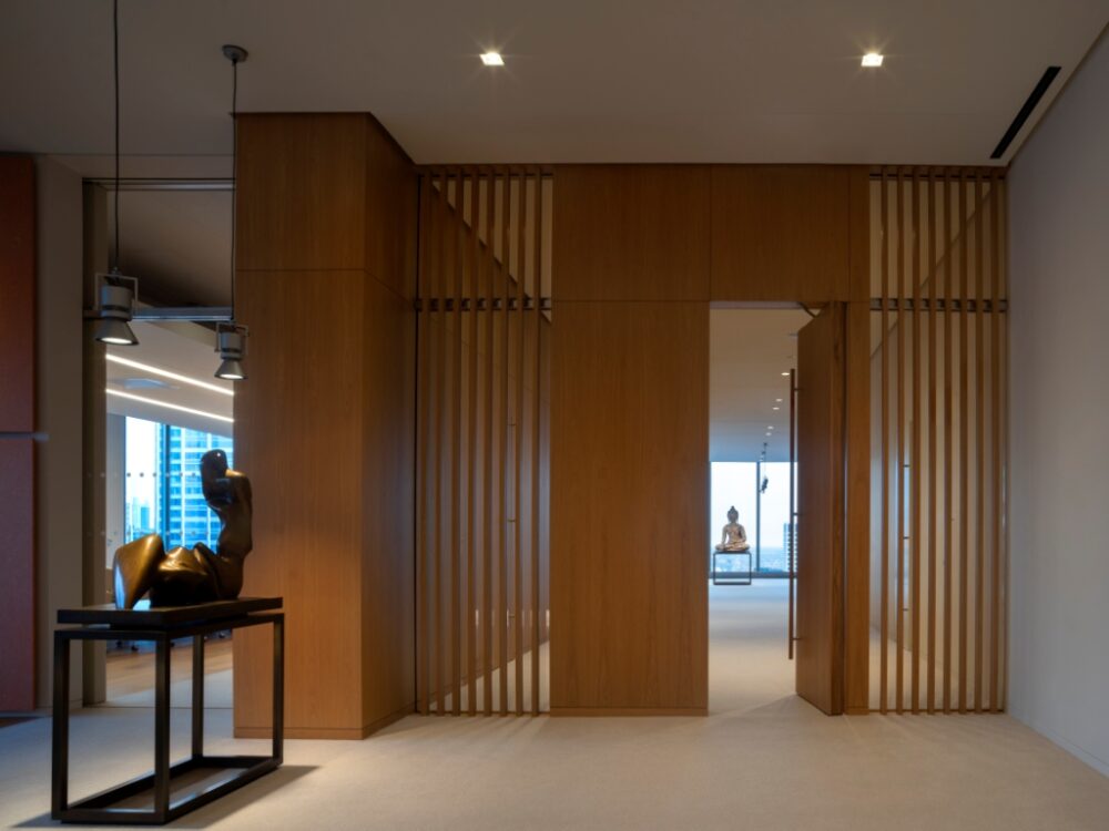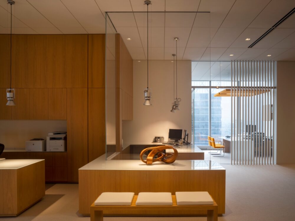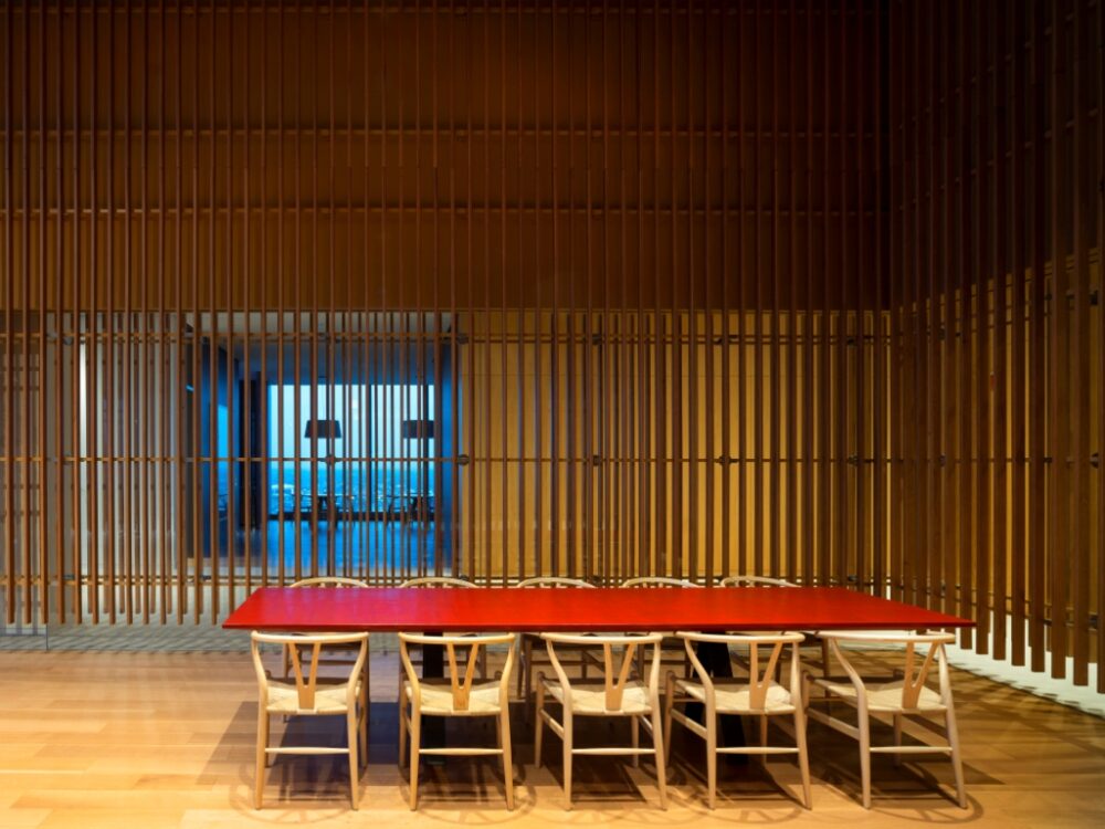 A seconda dei punti di vista, la pelle del Winter Garden, composta da due file di listelli lignei sospesi e non allineati fra loro, con un vetro trasparente posto nel mezzo, si dissolve o diventa opaca, generando molteplici punti di vista e un interessante gioco di luci e ombre. Completano la stanza una scultura sospesa in bambù, creata su commissione dall’artista giapponese Ueno Masao, e il tavolo disegnato da Junko Kirimoto, con finitura in lacca giapponese. Lo spazio ha un tocco orientale e proporzioni sapientemente misurate, in linea con le sensibilità italiane e giapponesi che animano lo studio.
