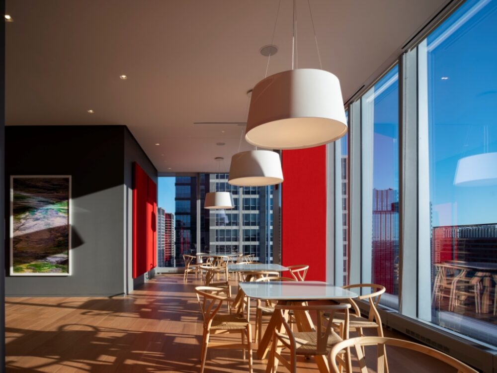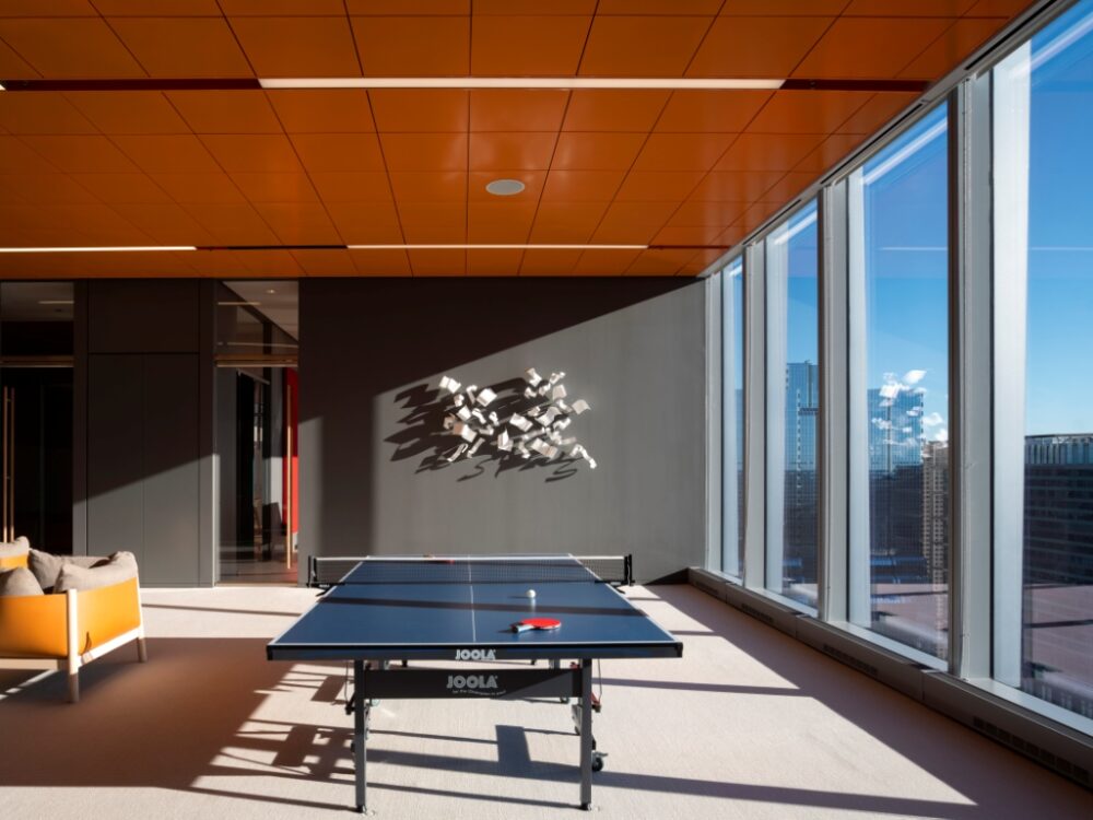Sospesi tra le nuvole, ma ben radicati nel contesto, i nuovi uffici direzionali disegnati dallo studio romano Alvisi Kirimoto occupano interamente il 32mo piano di un grattacielo nel vivace quartiere di West Loop, a Chicago. Il progetto, pensato per ospitare il quartier generale del cliente e parte della sua collezione di opere d’arte, gioca fin dall’ingresso su uno studiato gioco di contrasti. Entrando, infatti, sono subito visibili due ambienti contrapposti: da un lato la reception e dall’altro la playroom, entrambe caratterizzate da una grande vetrata che mette in comunicazione il visitatore con i due volti di Chicago, quello più urbano da una parte e quello più territoriale dall’altra. Dal punto di vista planimetrico, il fronte sud ospita le funzioni più rappresentative e di aggregazione come la reception, la sala riunioni, il Winter Garden, i percorsi espositivi e la zona ristorante, mentre il retro, orientato a nord, accoglie gli uffici privati e alcune aree comuni.