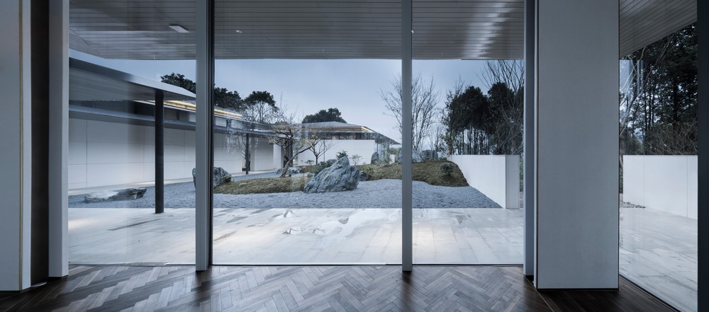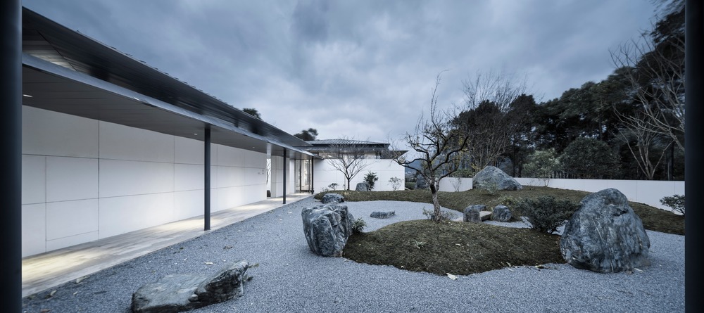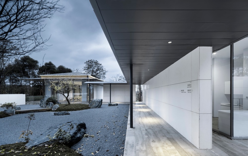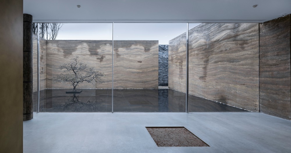 I tre giardini, Chuan, Yuan e Qi sono progettati secondo la forma e lo spazio di ogni cortile. Chuanè composto da due pietre, che sono in realtà un’unica pietra tagliata a metà, che interpreta la pioggia ed è utilizzato come panchina. Yuan è un’ulteriore transizione da esterno a interno e prende il suo significato dal drago nascosto del Libro dei Mutamenti o I Ching. È fatto di ghiaia color canapa scura, che simboleggia l’acqua: sei pietre sono combinate in gruppi di tre, due e una per mostrare i draghi che emergono dall’acqua. Qui la trama della parete in terra battuta sullo sfondo suggerisce l’arrivo delle nuvole. Qi, il giardino attorno al quale sorgono i tre volumi principali, mostra il punto di inizio della fitta foresta naturale che scorre fra le mura dell’edificio. Secondo lo Shan HaiJing – o Libro dei monti e dei mari, una descrizione geografica e culturale della Cina, in parte favolistica e mitologica, risalente a più di 2.000 anni fa – ci sono cinque montagne fatate nella parte orientale del mare di Bohai: Daiyu, Yuanjiao, Fanghu, Yingzhou e Penglai. Nel giardino Qi cinque isole indipendenti simboleggiano le cinque montagne fatate, e il verde che emerge dal muro è come una fonte, fatta dalle piccole gocce d’acqua che si diffondono.