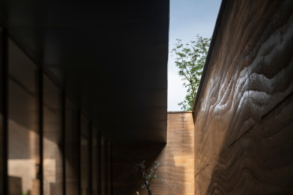 I volumi del padiglione sono in vetro e per realizzarli sono state utilizzate lastre di grandi dimensioni – 3×5 metri – così da ridurre al minimo le interruzioni alla vista e annullare la separazione fra il paesaggio e gli spazi interni. I tetti sono a falda. Molto interessanti i materiali utilizzati per le pareti che circoscrivono gli spazi esterni e funzionano da seconda quinta: terra battuta e scisto, una pietra grigio bluastra. La terra per le murature è stata ricavata dagli scavi del cantiere. Fortunatamente il suolo del sito è composto di strati che vanno dall’ocra, al rosso al bruno e che i progettisti hanno definito “la terra di cinque colori”. Gli strati, compattati secondo una tecnica tradizionale rivisitata con tecnologie moderne, danno vita a murature dalle texture cangianti e molto vibranti, che cambiano colore con la pioggia. Oltre alla terra sono stati impiegati materiali locali per il progetto, come tributo alla tradizione del villaggio: la pietra, alcune travi di legno antico e il bronzo. Mentre nella sala esposizioni al piano terreno sono esposte antiche reliquie delle dinastie Ming e Qing, raccolte nei villaggi vicini.