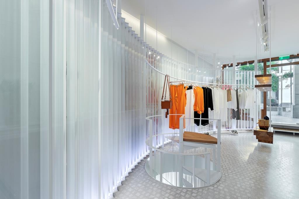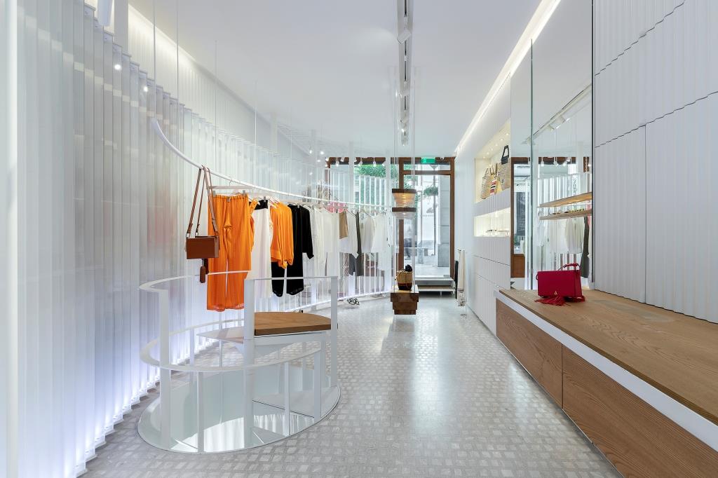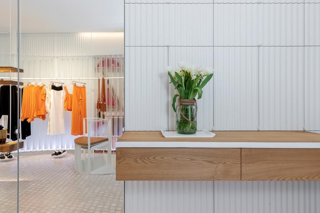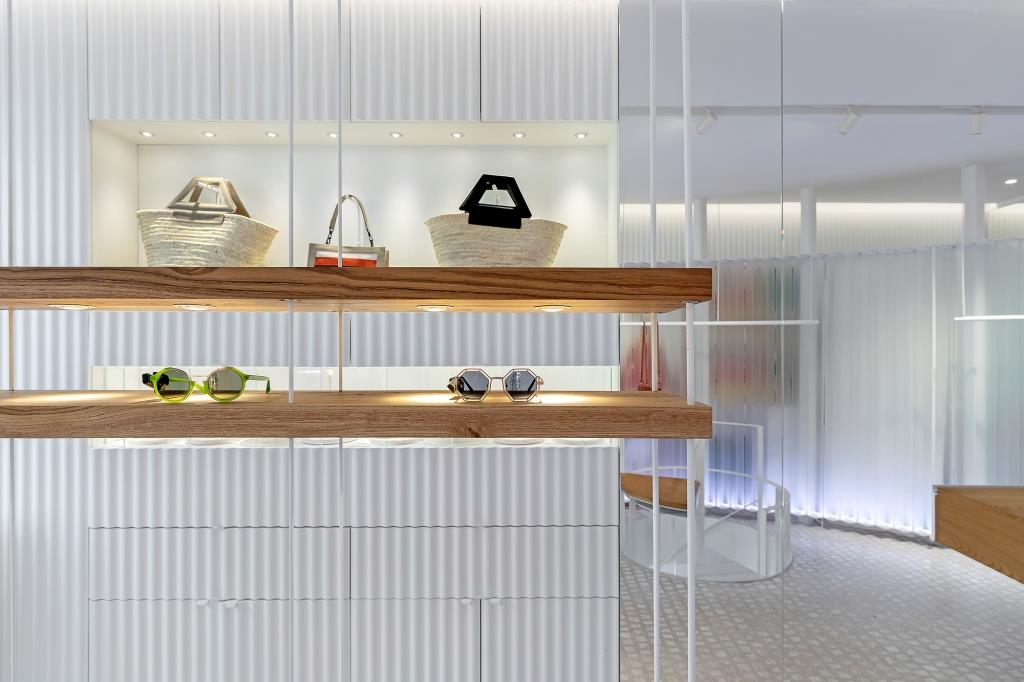 Oltre che su un pavimento chiaro in marmo ricamato e su un divisorio in vetro traslucido, plissettato e curvilineo, volto a separare l’area shopping principale dalle zone di lavoro riservate al personale.