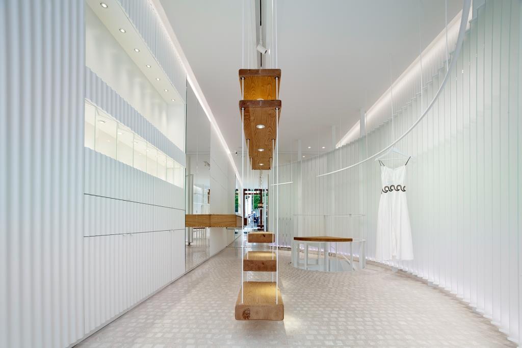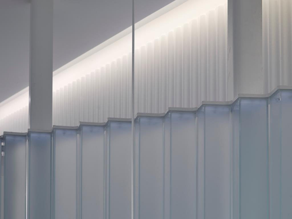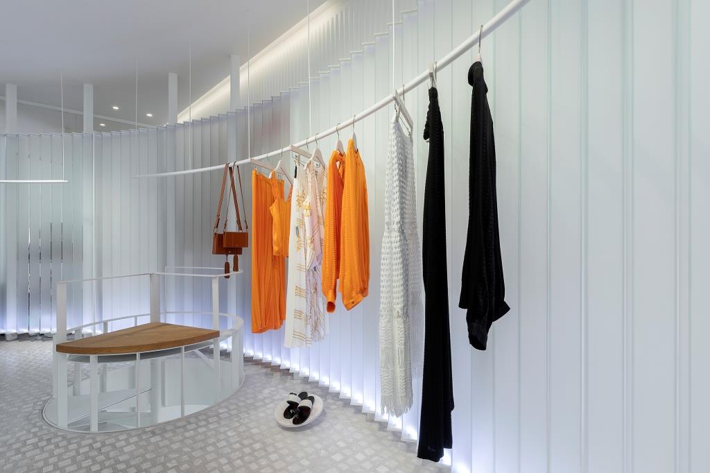 Tutti questi elementi riflettono la fluidità quale caratteristica basilare dei tessuti utilizzati in ambito fashion e incorporano un senso di plasticità anche grazie a un’illuminazione appositamente indiretta che si traduce in giochi di luci e ombre.