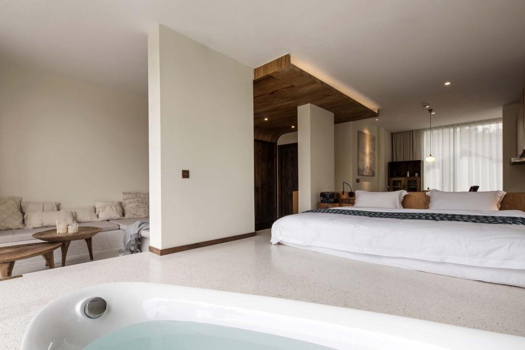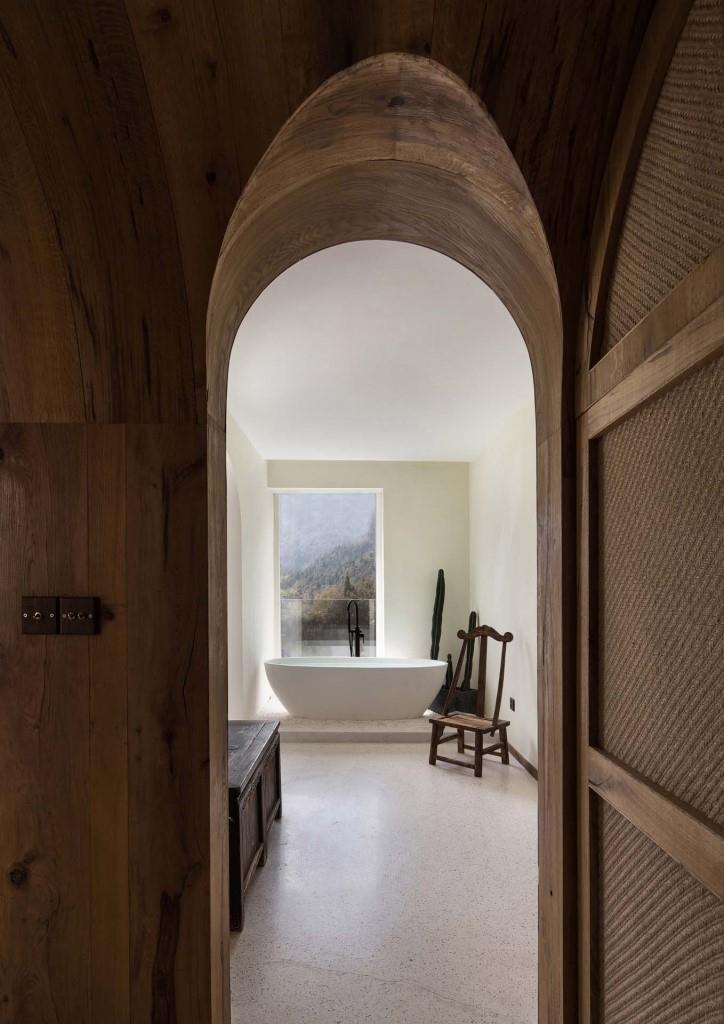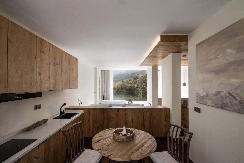 La scelta e la disposizione di arredi e complementi, che attingono tanto alla tradizione locale quanto al più rigoroso design contemporaneo, seguono un pattern distributivo che privilegia in ogni punto la visione del paesaggio naturale; sia il letto che la vasca da bagno freestanding, luogo del relax e della contemplazione, sono orientati verso il panorama lacustre, che all’occorrenza può essere occultato alla vista tramite tende oscuranti per garantire la massima privacy o goduto pienamente dalle logge esterne.