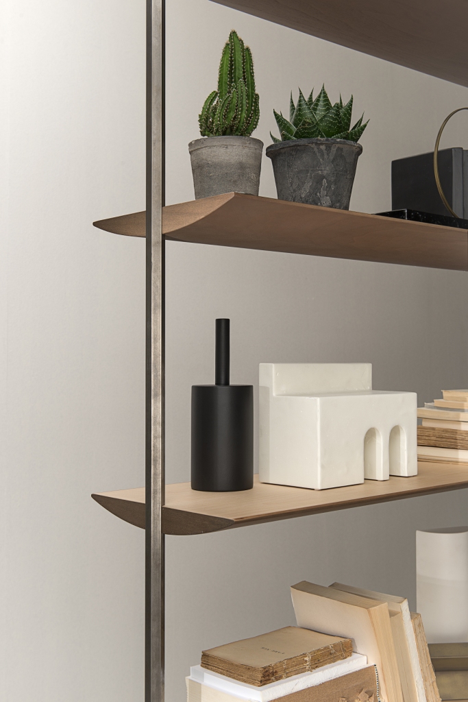 Linee pulite e semplici che si intersecano per equilibrare l’impatto visivo dell’insieme contraddistinguono anche la nuova libreria terra-soffitto e a parete Sailor, ispirata al mondo della nautica. Il passo arioso dei montanti verticali a sezione esagonale contrasta con il ritmo più̀ fitto delle mensole affusolate, create accostando essenze o laccature in un raffinato gioco di chiaro-scuri e di ebanisteria.