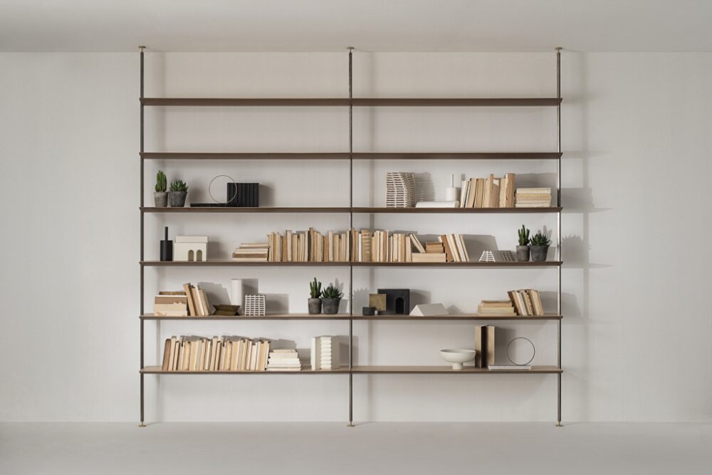 Linee pulite e semplici che si intersecano per equilibrare l’impatto visivo dell’insieme contraddistinguono anche la nuova libreria terra-soffitto e a parete Sailor, ispirata al mondo della nautica. Il passo arioso dei montanti verticali a sezione esagonale contrasta con il ritmo più̀ fitto delle mensole affusolate, create accostando essenze o laccature in un raffinato gioco di chiaro-scuri e di ebanisteria.
