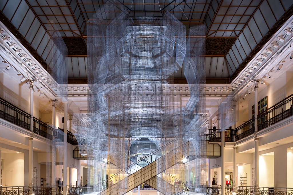 Aura, invece, è l’installazione realizzata all’interno del Bon Marché Rive Gauche a Parigi, che si misura con il concetto di rovina. Una coppia di cupole, in rete e in lamiera metallica, sono sospese a soffitti in vetro progettati da Gustave Eiffel. In un equilibrio da ricercare come quello fra passato e contemporaneità.