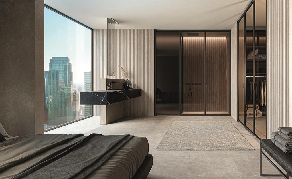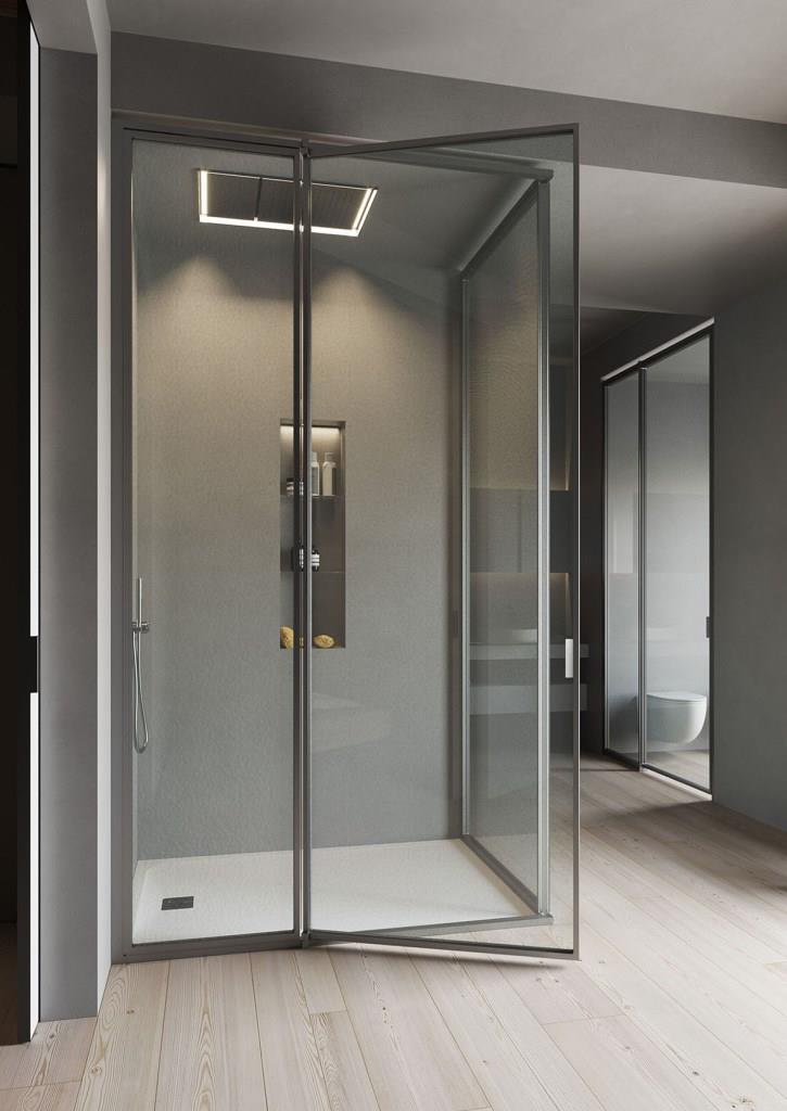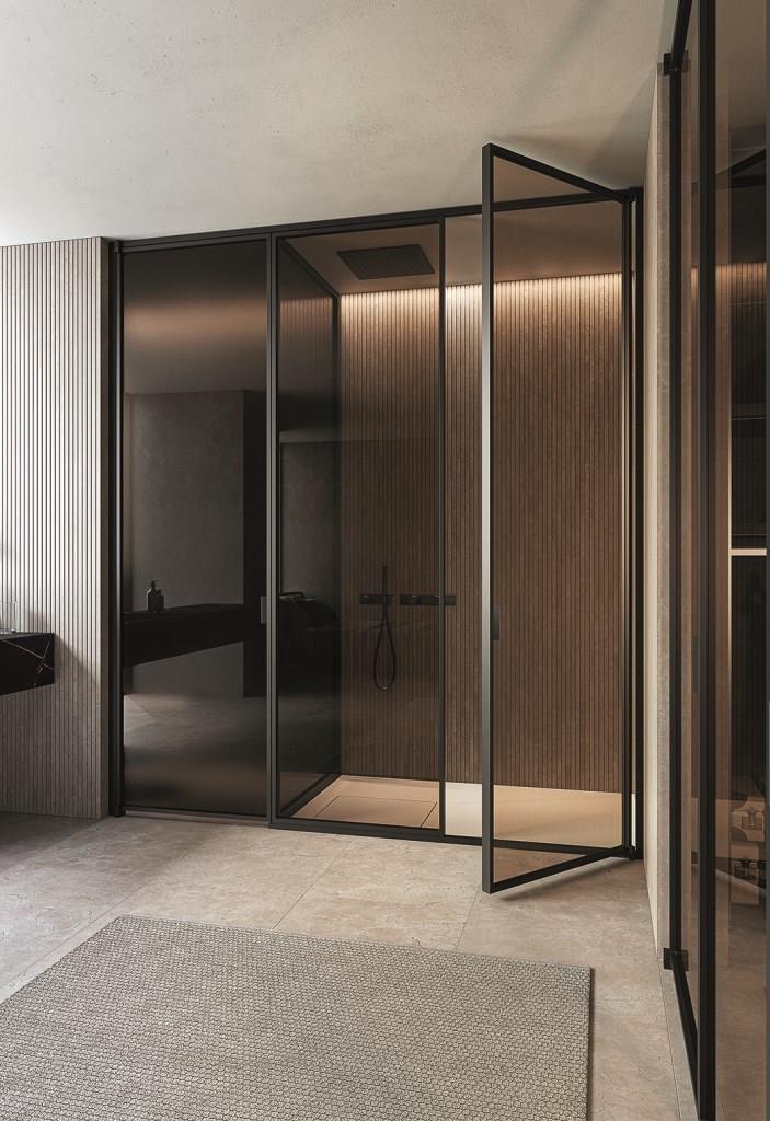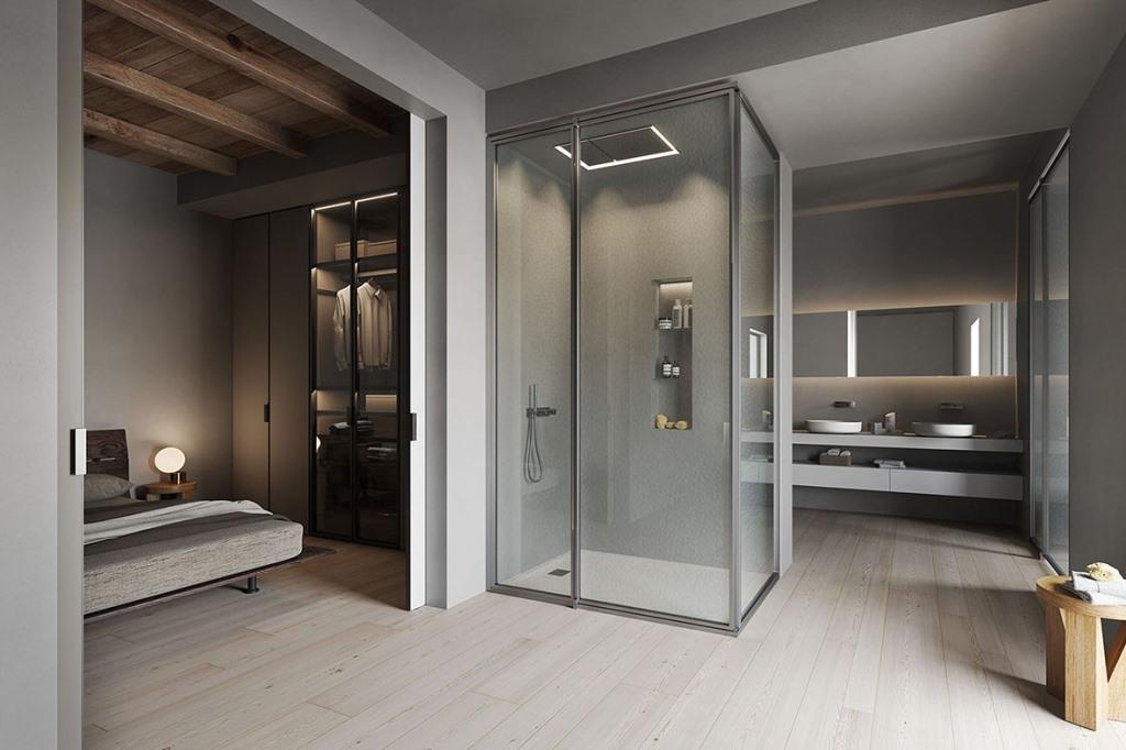 Suite di Vismaravetro è un sistema flessibile, concepito per delimitare in un’unica soluzione la zona doccia