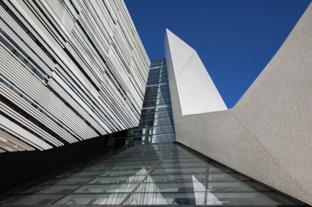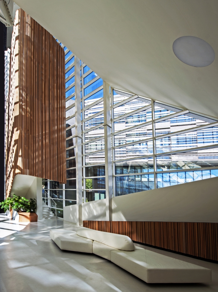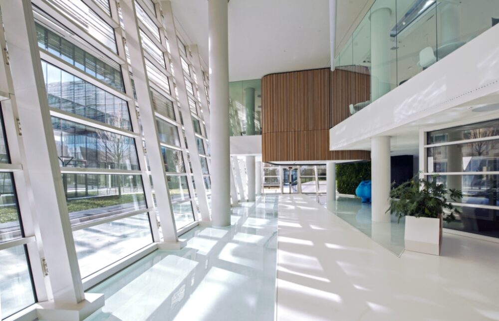 Inoltre, questa soluzione ha permesso di combinare la funzionalità e la razionalità esecutiva di una facciata a telai ad alte prestazioni all’elegante estetica della facciata Schüco SFC 85, per un “look” esterno completamente in vetro, uniforme e di grande impatto. Questo sistema è stato scelto in particolare per la hall e l’atrio, dove si rendeva necessario massimizzare l’apporto di luce naturale in zone di elevata affluenza e di continuo passaggio. L’effetto finale è quello di massima trasparenza ed eleganza.