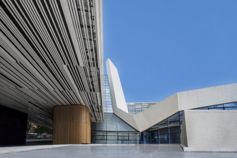 La memoria formale della costruzione è rimasta inalterata: i moduli originari, con la caratteristica forma “a L” sono stati reiterati – realizzando il completamento del lotto su tutti e tre i fronti stradali. L’intero organismo è unito da un elemento sopraelevato, che si espande sopra il resto dell’edificio, generando un’espressiva e nobile sopraelevazione dello stesso, inglobando e ridando unitarietà alle singole parti in una logica architettonica contemporanea. Tale volume “ponte”, che ospita gli uffici della Presidenza e dell’alta dirigenza, realizza la connessione funzionale dei quattro blocchi operativi e completa la perimetrazione del lotto. Un elemento architettonico che sottolinea l’andamento orizzontale del volume, realizzando un gioco vibrante di luci ed ombre sulle superfici.