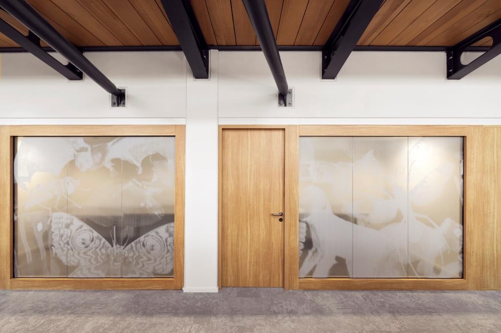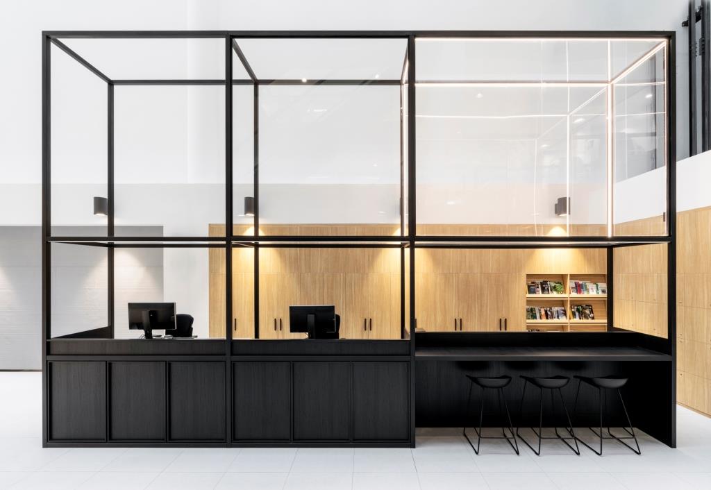Un’impostazione che ricorre anche negli ambienti ufficio, inseriti all’interno di ampi box vetrati sostenuti da cornici in acciaio ispirati a quelli utilizzati per le esposizioni museali.