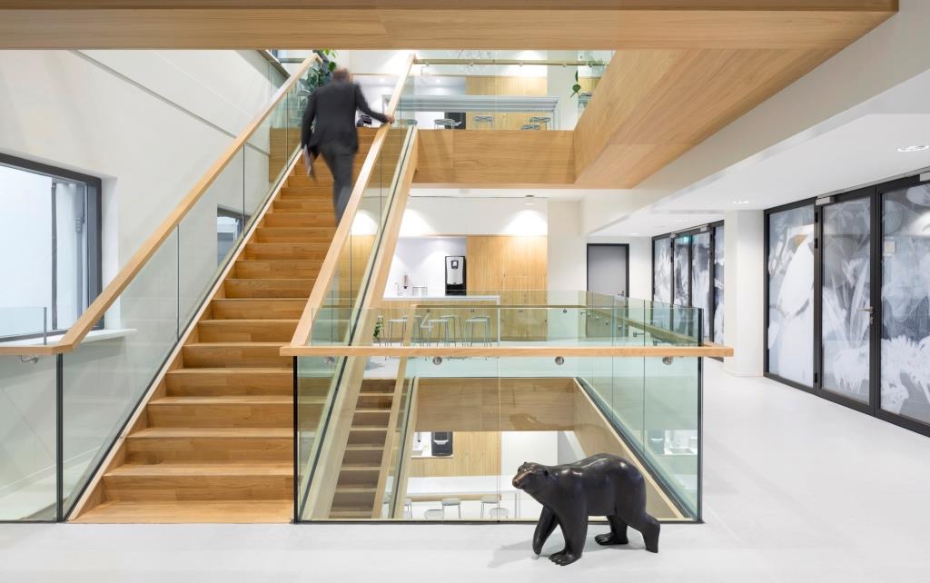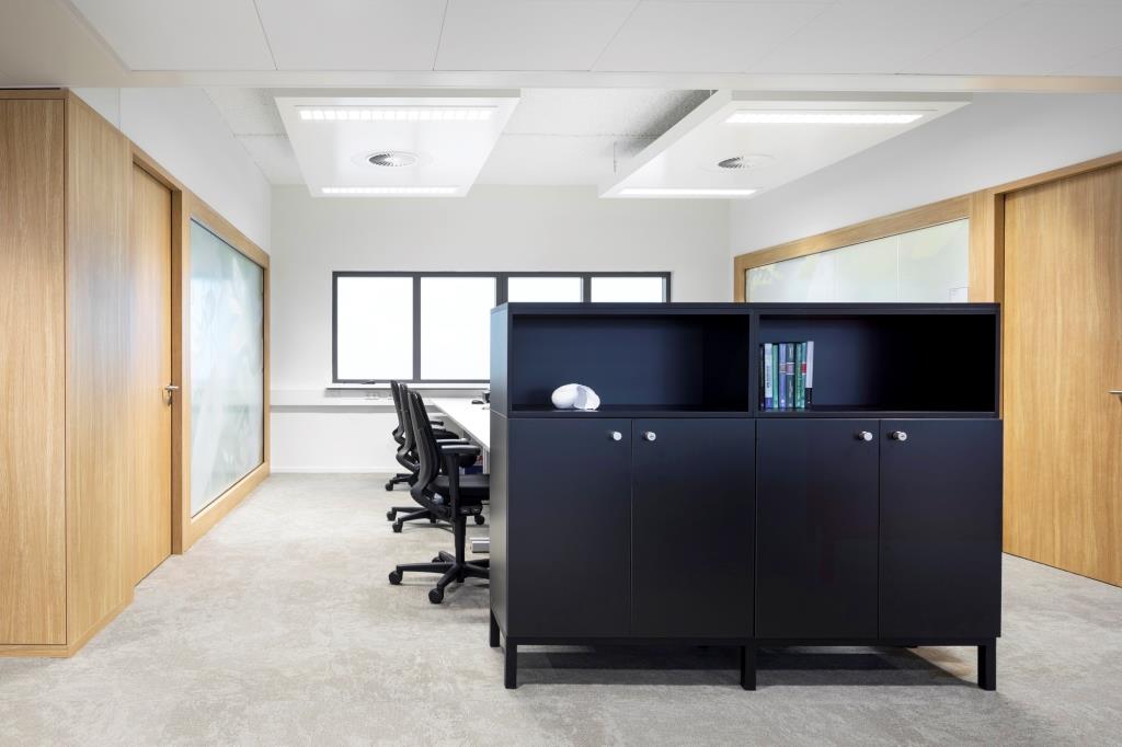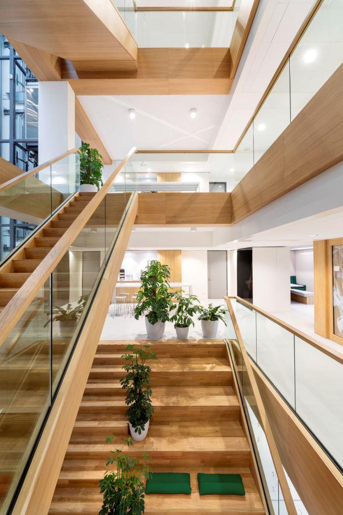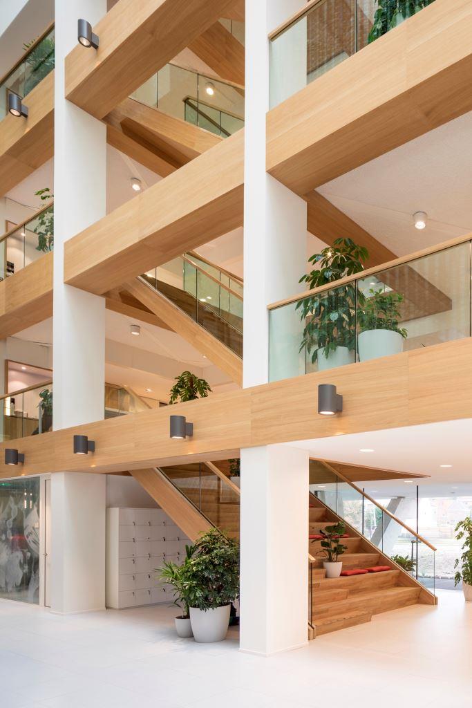 L’area uffici occupa sei piani, tutti accessibili dal piano terra tramite un corpo scale situato in posizione centrale, che ospitano spazi di lavoro e dedicati alla ricerca oltre agli ambienti di servizio, con sale riunioni e box privati che intervallano gli ambienti comuni.