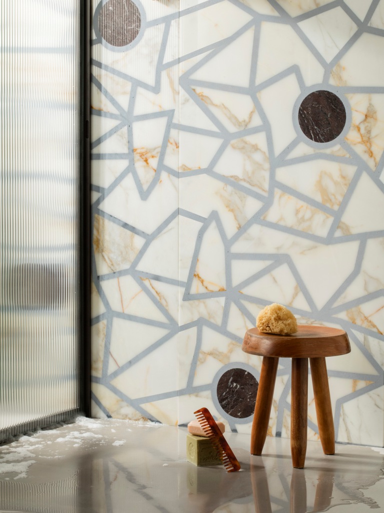 Optic, infine, è contraddistinta da forme dello stesso marmo ricomposte tra loro, delimitate da un gioco ottico di linee discontinue che si inseguono senza mai incontrarsi.