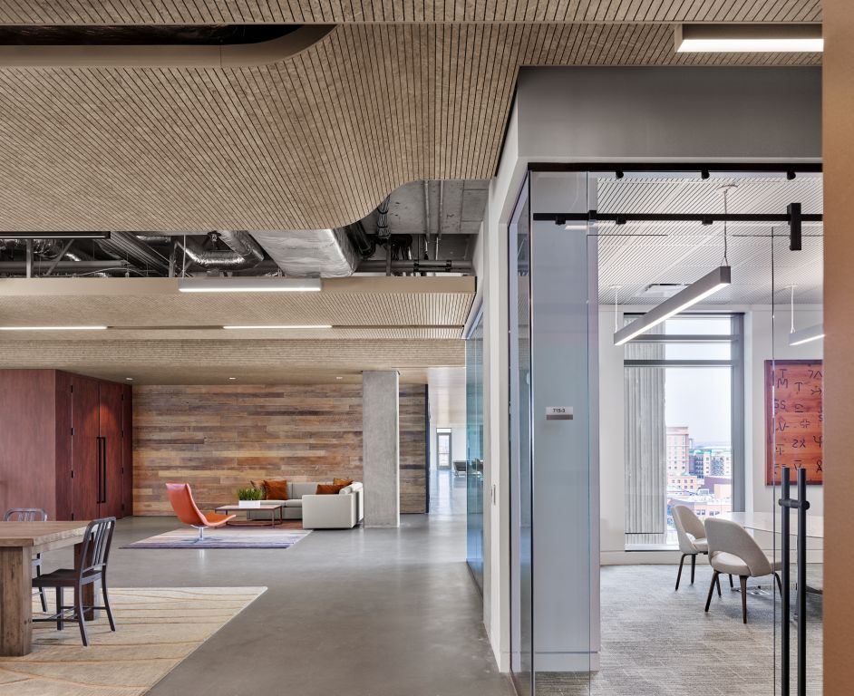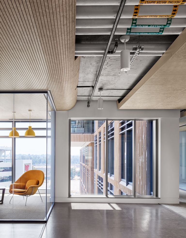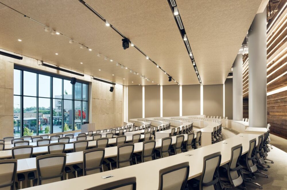Spazi enormi e ampi volumi impongono agli interior designer di concentrarsi sul tema dei rivestimenti a soffitto, selezionando materiali fonoassorbenti che possano bilanciare l’acustica potenzialmente compromessa dalle numerose vetrate progettate per favorire uno scambio con l’ambiente esterno.
