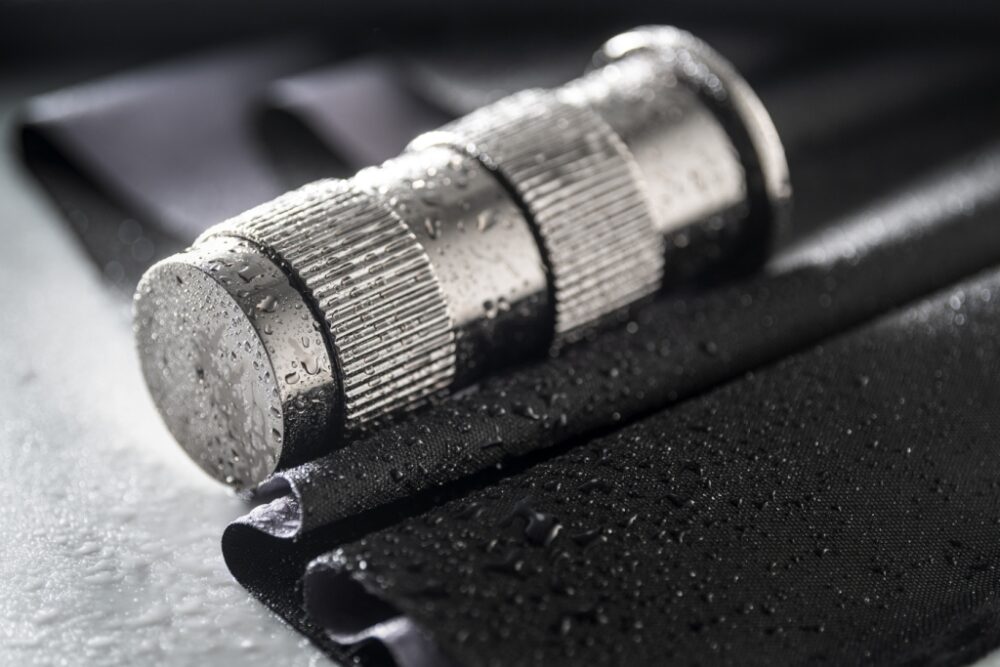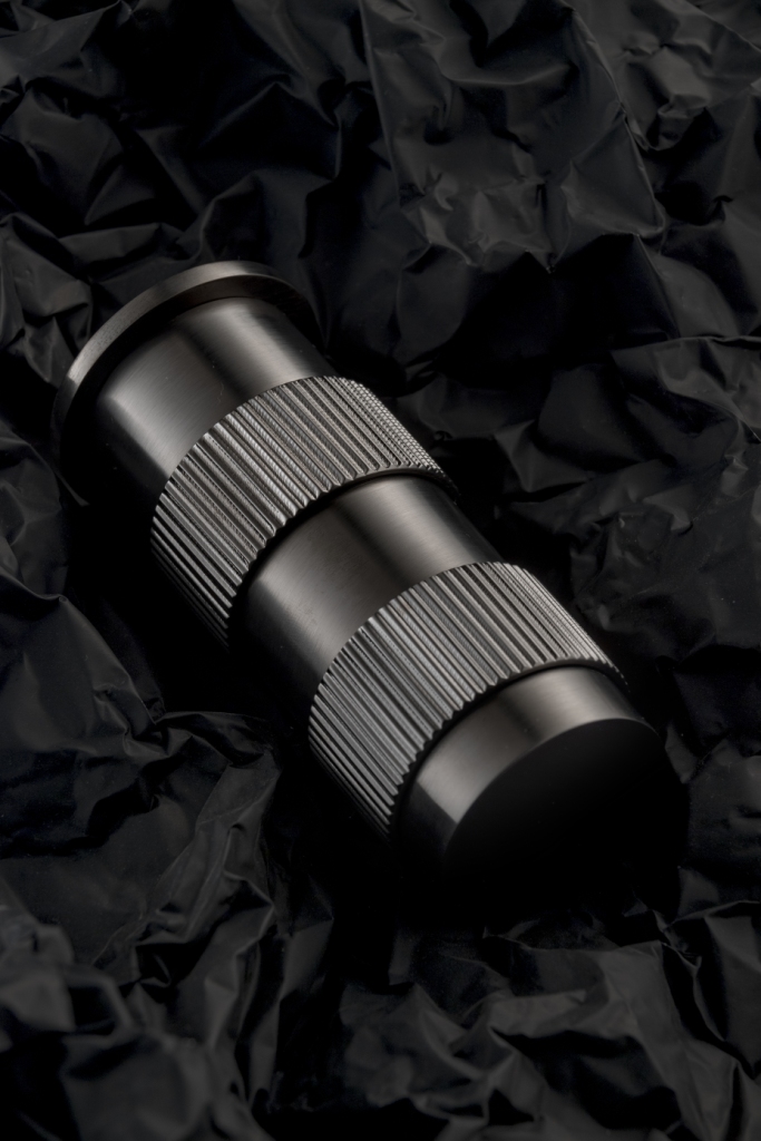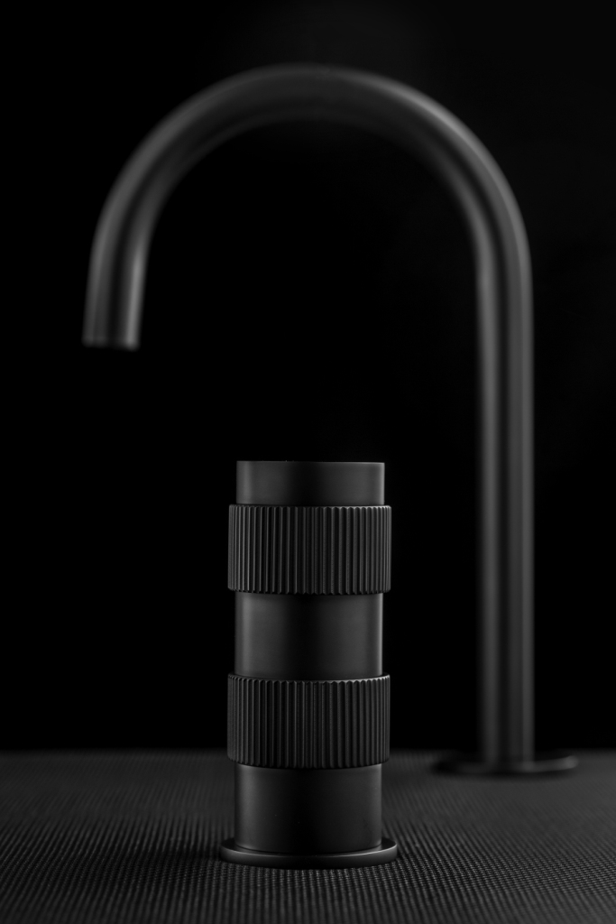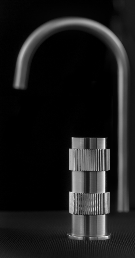 Linee semplici e pulite, 12 finiture combinabili, un corpo cilindrico in ottone con anelli ricavati dal pieno che, replicando il funzionamento delle ghiere di messa a fuoco dell’obiettivo della macchina fotografica, regolano l’erogazione di acqua calda e fredda.